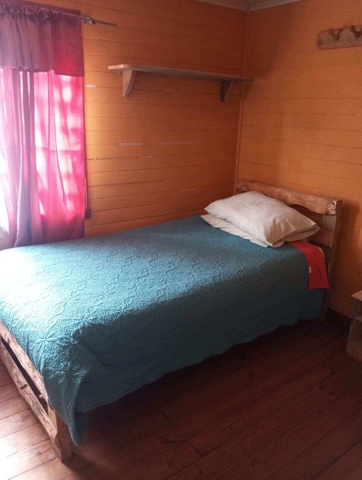 Cabaña de un ambiente inmersa en un pequeño bosque de hualles. Cuenta con baño, lavaplatos, cocina, estufa a leña, agua natural de la cordillera, pequeña terraza y parrilla. Cuenta con electricidad y frigobar. Ideal para una pareja sola o con un niño, ya que cuenta con cama matrimonial y un sofá. A 4 kilómetros de Melipeuco y a minutos del Parque Nacional Conguillio, Salto Truful Truful, China muerta, Valle Alpehue y otros. Se ofrece desayuno opcional.