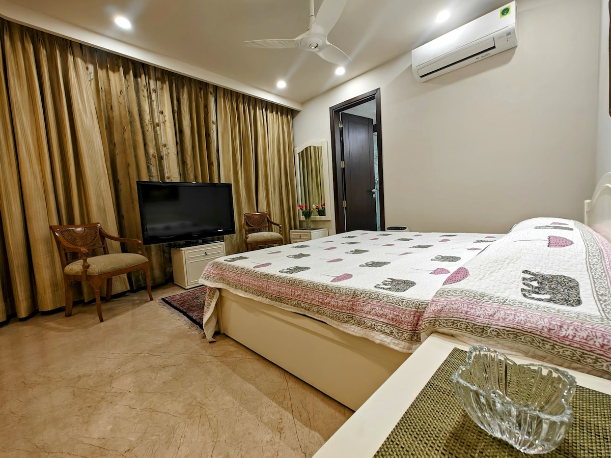 在我們位於南德里豪華Shivalik的寬敞3BHK公寓中體驗寧靜。Blissful Soul Abode擁有3間通風的臥室、舒適的大廳、設備齊全的廚房和3.5間現代化的浴室。專為提供安寧與舒適而設計。享受高速 Wi-Fi、空調和 24 小時保全服務。非常適合放鬆,而不是派對。立即預訂,在這個寧靜的天堂中與你的內在自我重新連結。