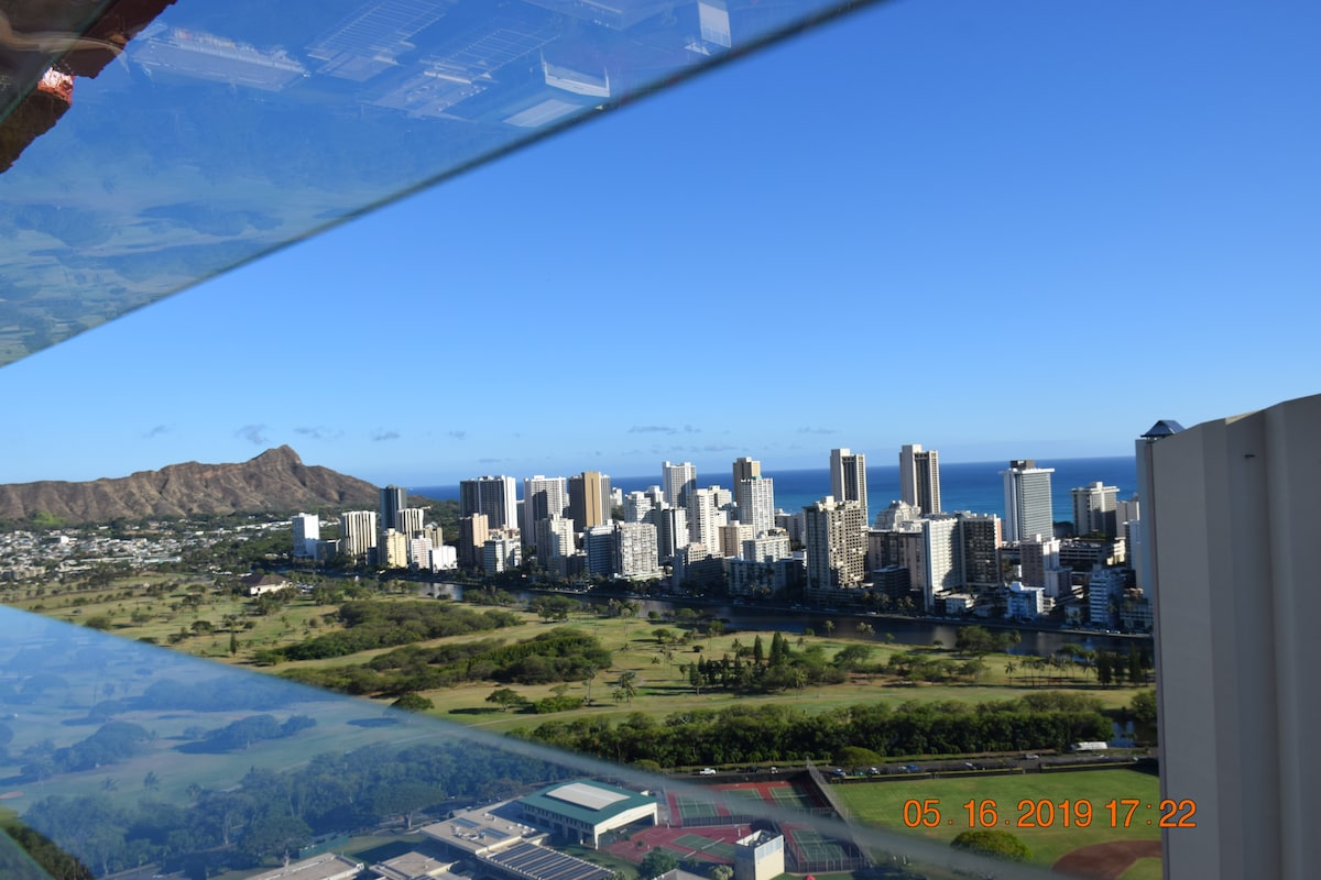 Located on 35th floor of the Hawaiian Monarch building, this place of two adjacent studio units is the perfect place to enjoy your family vacation! With fabulous views of city, the mountains, the Ala Wai Canal, the Diamond Head, and ocean, unit A comes with two Twin XL beds that can be combined into a King bed, a full bath and full kitchen that includes electric range, full size refrigerator. Unit B has a queen bed, a full bath and a kitchen. Easy walking to Waikiki beach, restaurants and shops.