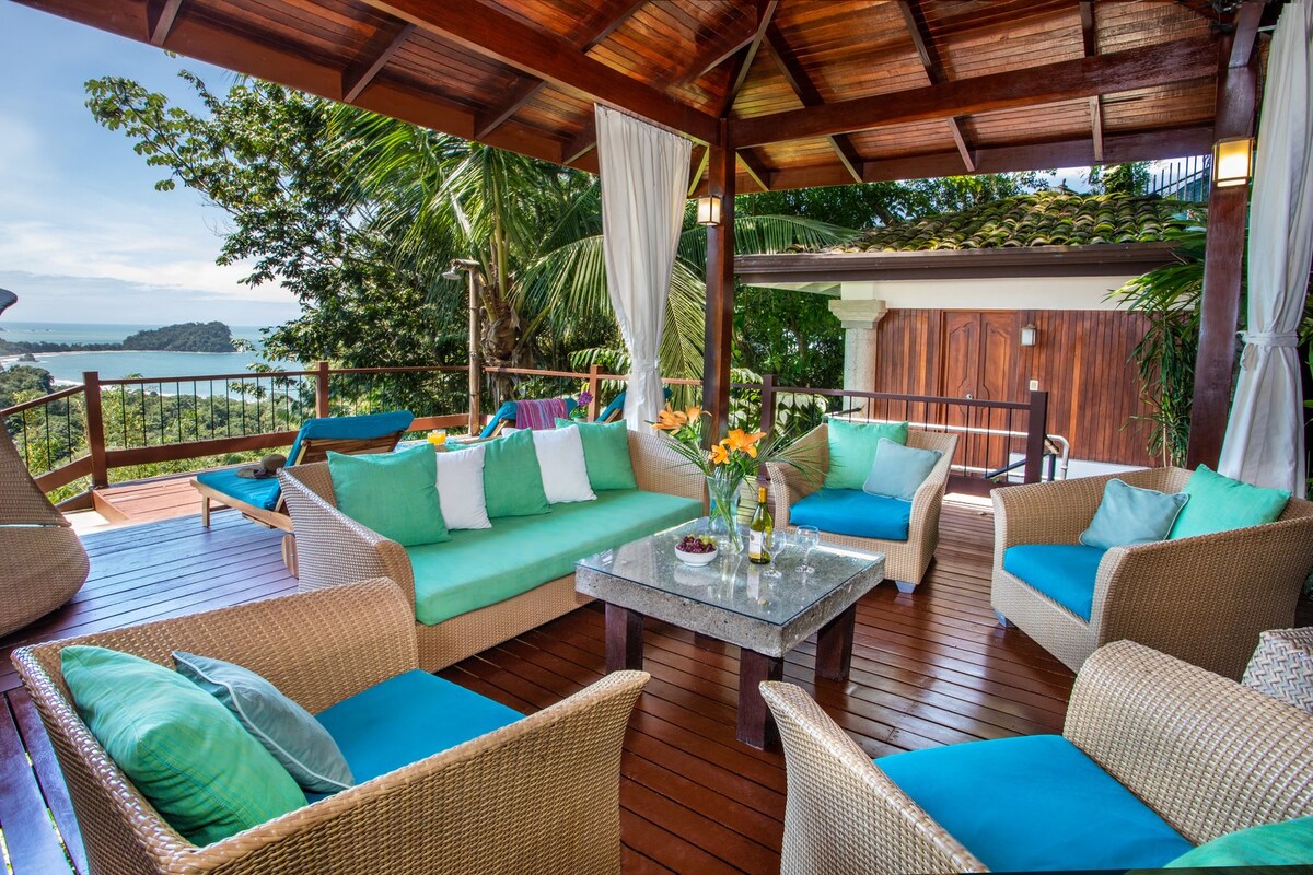 Mountain Top Mansion in Manuel Antonio. Private pool, jacuzzi, amazing views, air conditioning, gated community, and outdoor showers. Designed by local world famous Architect, this house is the nicest three bedroom in the Manuel Antonio! House has a full kitchen, a big loft with amazing views, retractable glass wall on the ocean view side, so house opens and gets huge ocean breeze. 12 minutes to Manuel Antonio National Park and 5 minutes to Marina Pez Vela. When only the best will do!