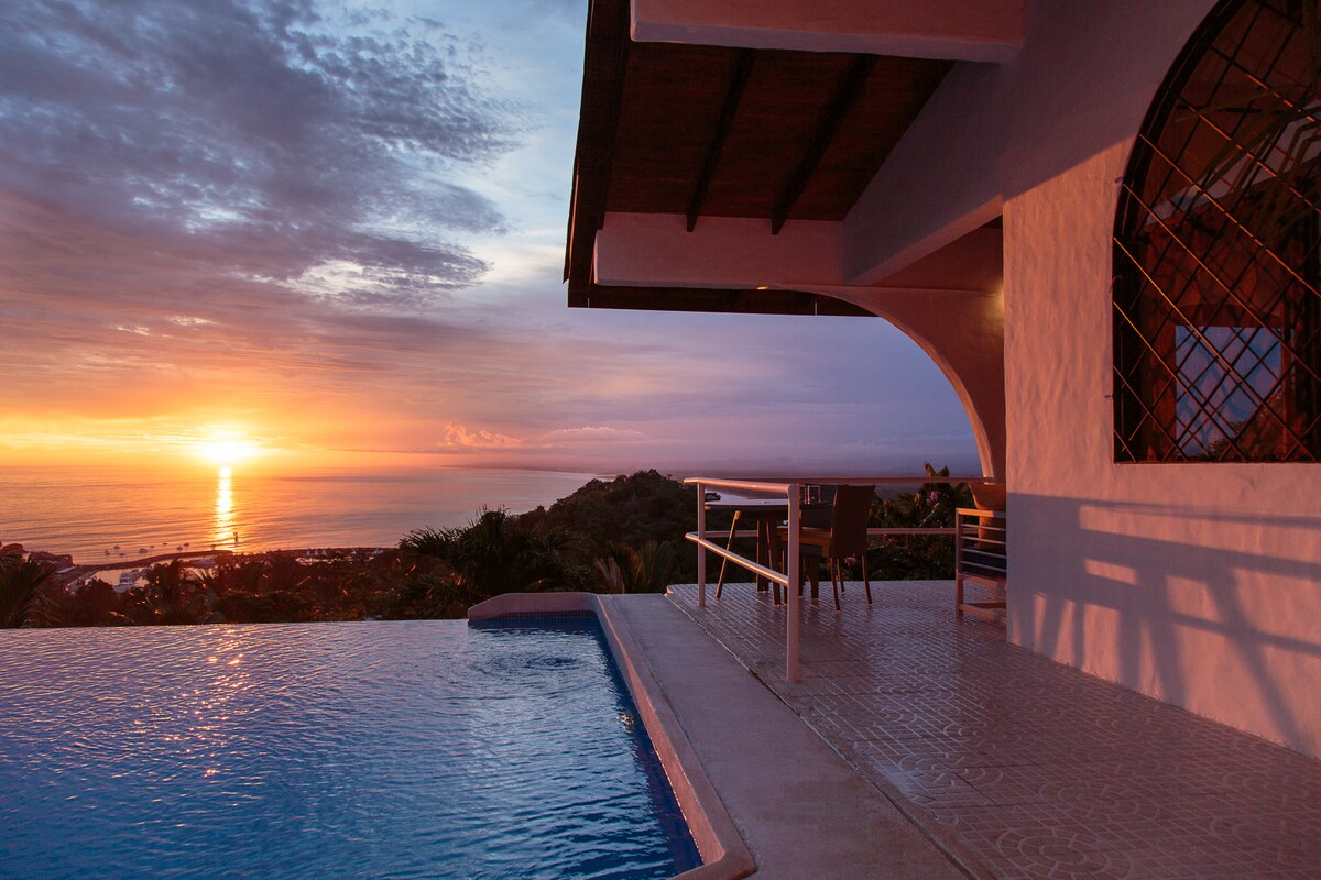 Mountain Top Mansion in Manuel Antonio. Private pool, jacuzzi, amazing views, air conditioning, gated community, and outdoor showers. Designed by local world famous Architect, this house is the nicest three bedroom in the Manuel Antonio! House has a full kitchen, a big loft with amazing views, retractable glass wall on the ocean view side, so house opens and gets huge ocean breeze. 12 minutes to Manuel Antonio National Park and 5 minutes to Marina Pez Vela. When only the best will do!