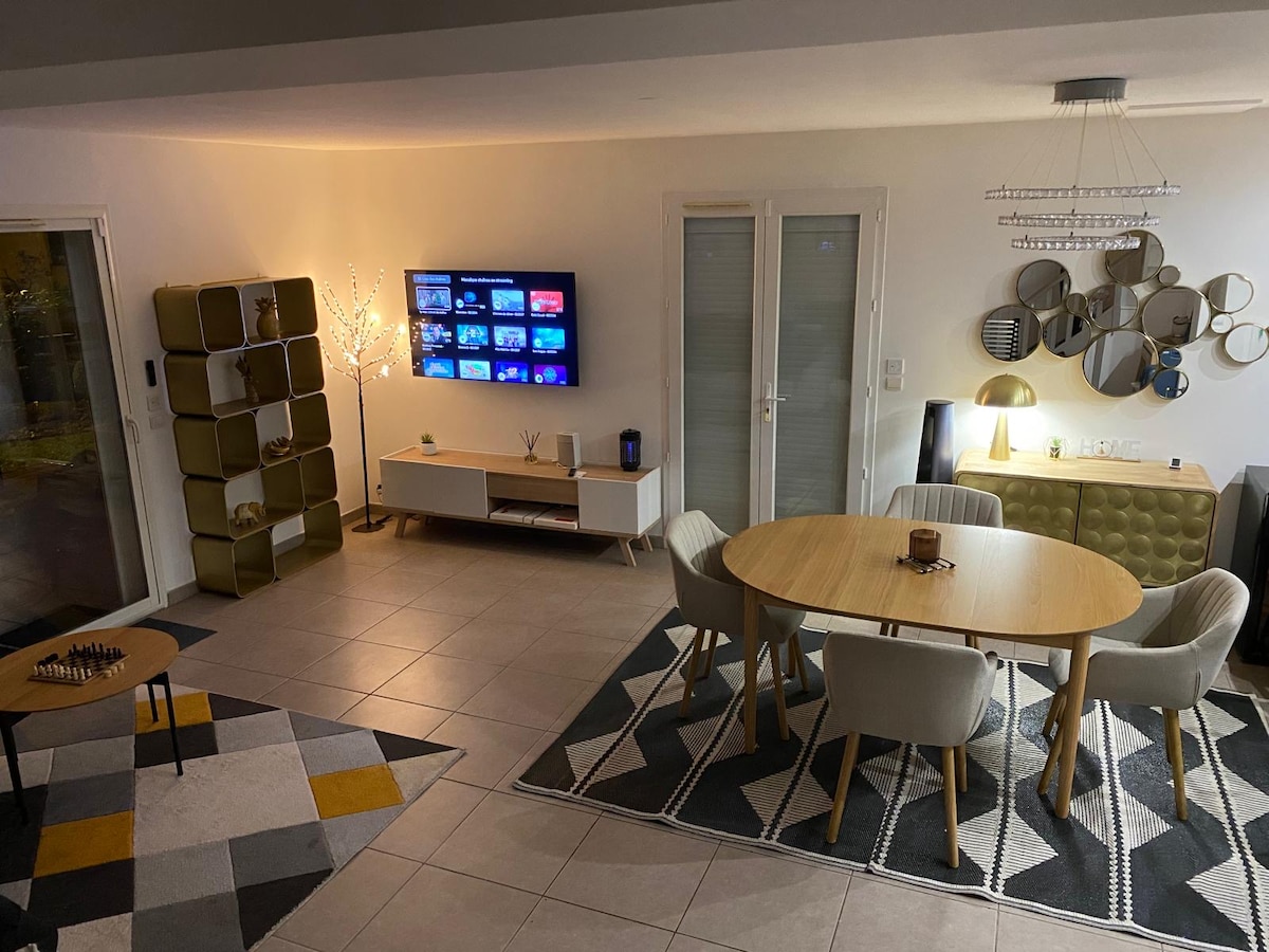 Appartement duplex indép dans villa neuve 2 pers + 1 enfant - 3 ans jardinet privé Quartier en construction Possible quelques nuisances sonores en semaine calme soir et weekend situé à 5 mn en voiture des plages de Canet Ste Marie st Cyprien 15 mn du VILLAGE de NOËL du BARCARES Parking gratuit Entrée privée Cuisine équipée Chambre lit double lit enfant WC douche TV clim wifi TABLE chaises parasol Grill Etat impeccable PETIT chien ok 👍 loc à la journée tte l année semaine juillet/août