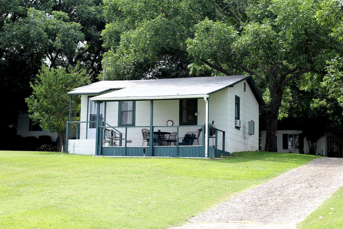 Take a break and unwind at this peaceful oasis on a working ranch. Built in the late 1800's. Immigrant family homestead. The Indians use to meet under the large oak trees in the front yard. The cottage is about a 5 minute drive to town, so you have the advantage of being peacefully out in the country enjoy the dark night sky full of stars. There are 3 AC window units in the Cottage, the Living room, the Master and the Kitchen, the house easily cools to 70 degrees on a hot day.
