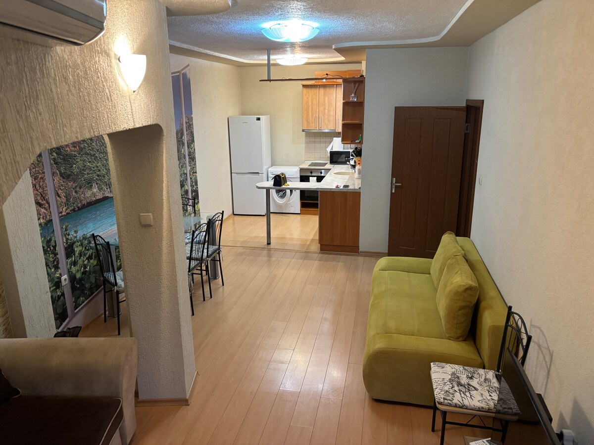 Nuestro encantador apartamento es perfecto para una estancia cómoda y con estilo. Cuenta con calefacción central y aire acondicionado, un dormitorio con cama doble, una sala de estar con sofá cama y cocina equipada, además de un balcón para disfrutar del aire fresco y el café matutino. Hay aparcamiento gratuito y wifi rápido. Ubicado frente al Parque de Sandanski, ideal para un paseo. Cerca también encontrarás una colina con senderos en el bosque y vistas preciosas de Sandanski.