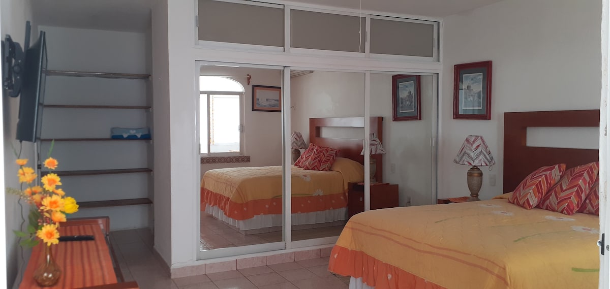 位於距離巴亞爾塔港口海軍基地兩個街區的 AMBAR 大樓的優質公寓。位於巴亞爾塔港最好的酒店區。游泳池、按摩浴缸、海景、半個街區外即可到達海灘,距離「La Isla Shopping Village」和 Galerias Vallarta 兩個街區。 1 間臥室:加大雙人床 2號房:兩張單人床和額外的床墊 客廳:一張充氣床墊 兩間全套浴室 全套廚房、WiFi、智慧電視和每個房間的空調、洗衣機和烘乾機。