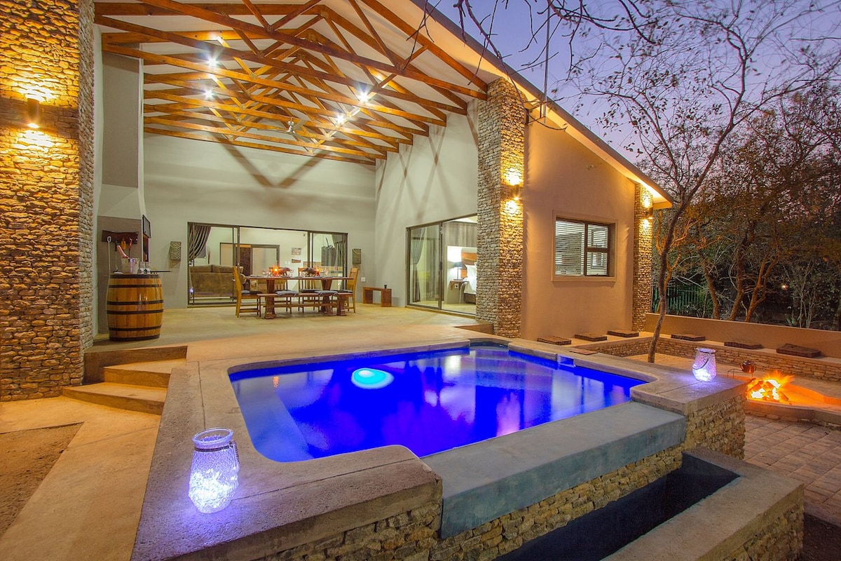 Birdsong is a private, self-catered, and solar-powered house in a wildlife conservancy adjoining Kruger National Park. Relax on the downstairs outdoor lounge with heated pool as zebra, kudu, and many others stop by to visit. Watch the sun set from the hammock on the upper patio. Exercise in the gym space. And if you just can't get away from work, there is a large table upstairs with a beautiful video background! Birdsong is just 15 minutes from Kruger's Crocodile Bridge gate.