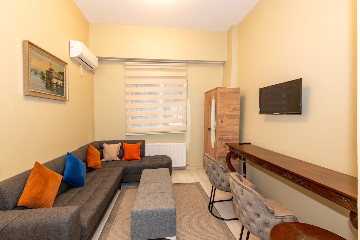這是一間擁有140年歷史建築的三樓,可欣賞壯麗景觀的公寓。 房間面積為45平方公尺,有一張加大雙人牀。房間內有閣樓樓層。 我們可以帶著孩子來,為他們打造遊樂場或增加一張牀。 它介於Beyoğlu和Iişhane之間。交通非常方便。距離巴士站1分鐘路程,距離地鐵9分鐘路程。