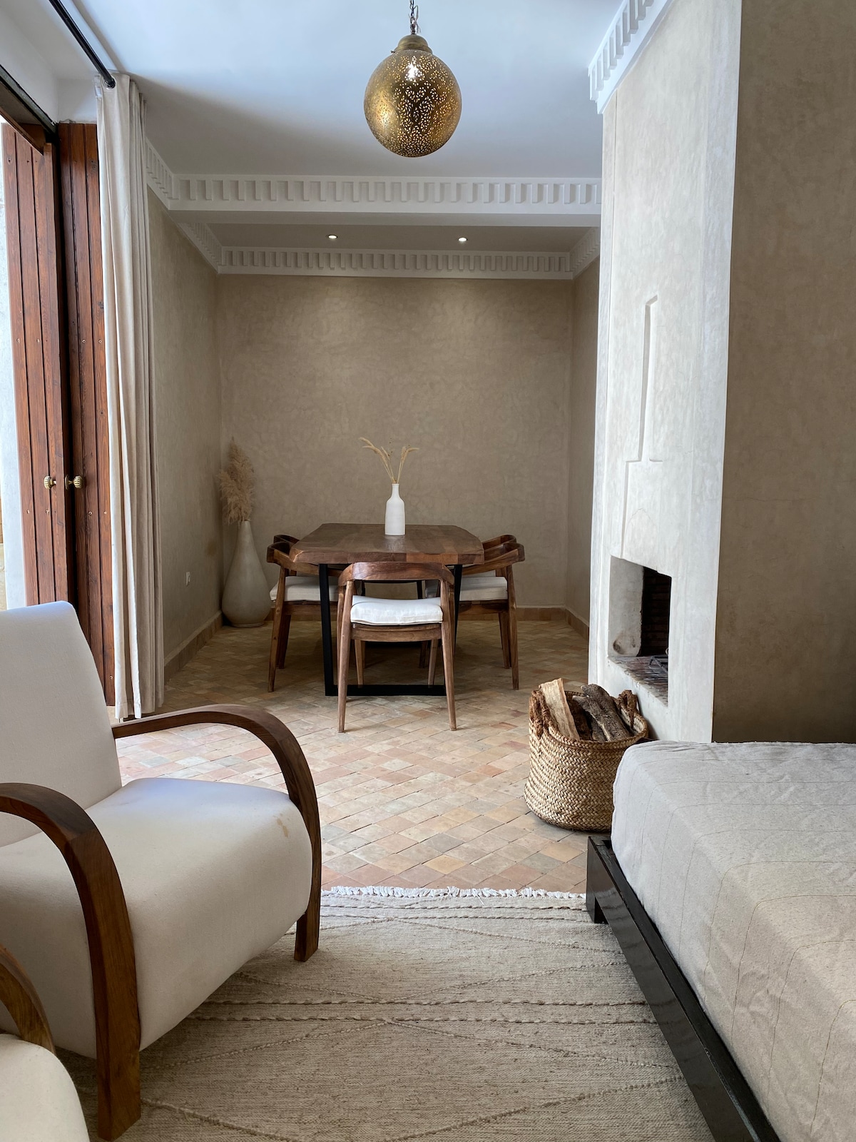在這個設計時尚又安靜的空間中好好放鬆身心。這間令人難忘的摩洛哥傳統庭院別墅絕非尋常,採用時尚的設計方式,圍繞著一個圓形的露臺和樓梯,牆壁上鋪設著迷人的傳統紅磚。為了與這種設計風格取得平衡,摩洛哥傳統庭院的其他地方則以米白色的塔德拉克石膏和白色的 bejemat 瓷磚裝飾。這個地方明亮通風,美麗的屋頂露台上有一個泳池,讓人放鬆身心。