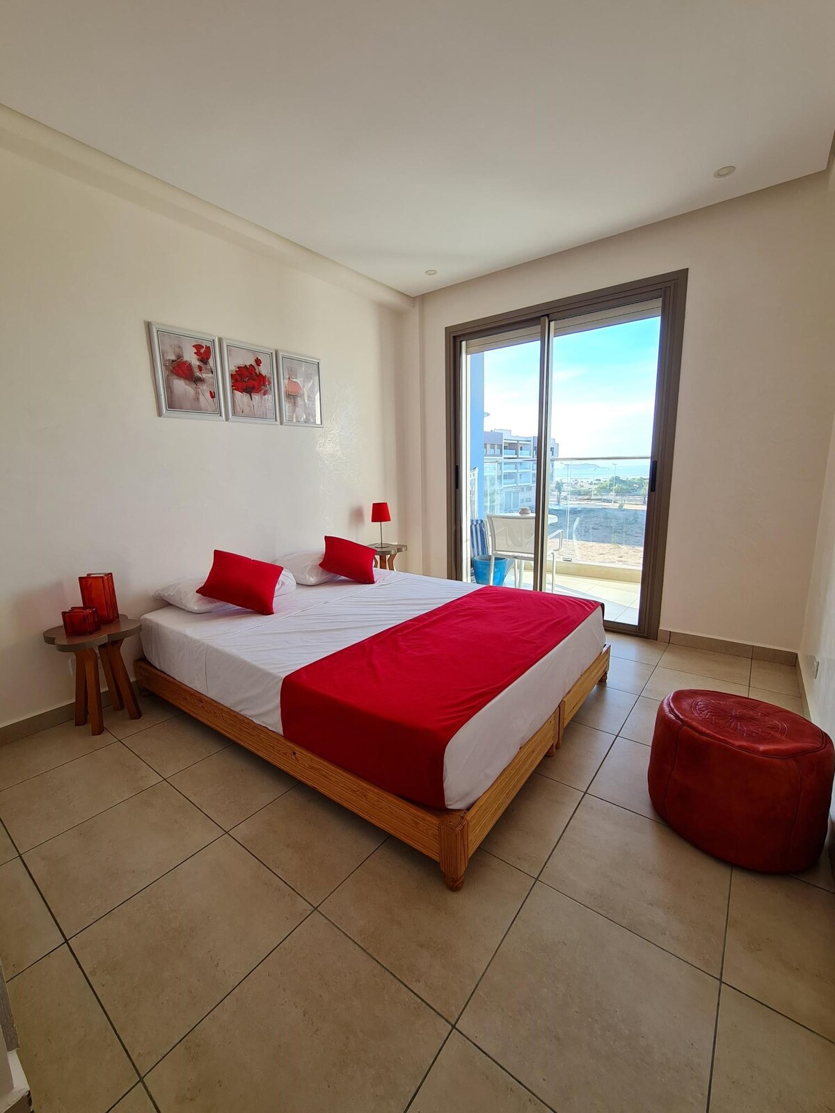 豪華全新海濱公寓。125平方公尺。 位於一棟新安全大樓的3樓和最後一樓,配有電梯和24小時門衛。 俯瞰大海的美景,直至舊麥地那。 靠近風箏衝浪站和最好的餐廳和咖啡廳。 大樓下有免費停車位。 私人安全泊車位,每晚100迪爾汗