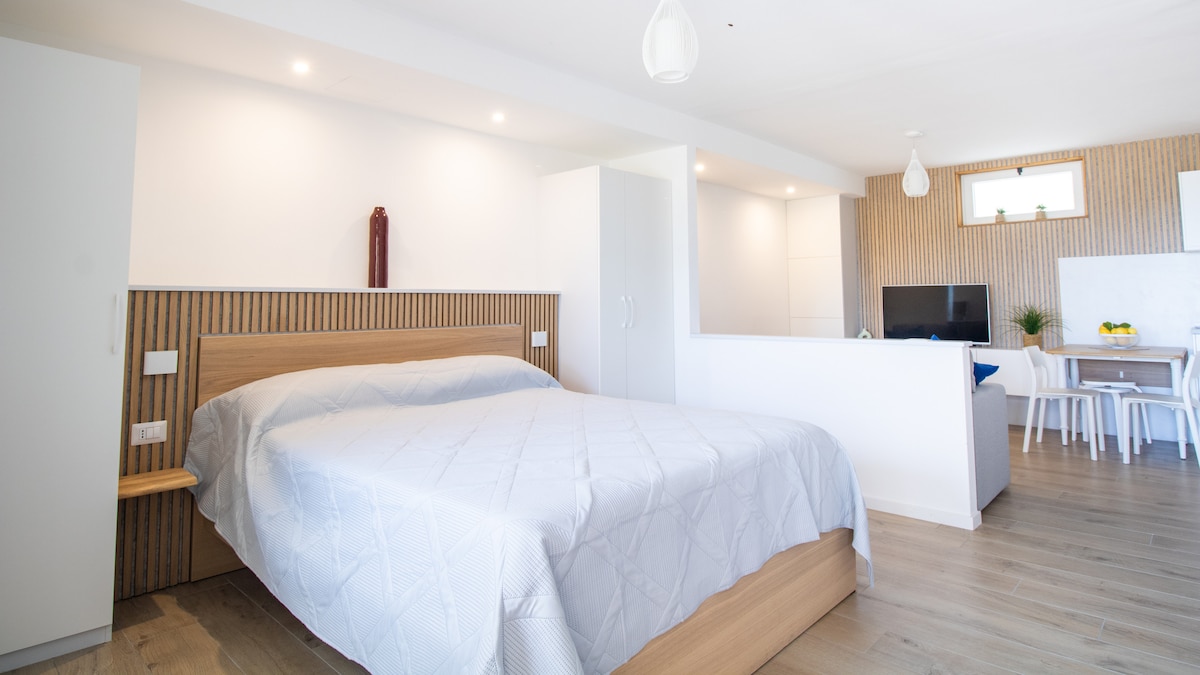 Grazioso Monolocale indipendente, accogliente, con ingresso libero e gratuito alla Piscina(ACQUA SALATA, NON CLORO) praticamente con acqua di Mare!!! Completo di tutto...letto matrimoniale, bagno spazioso, tv led satellitare, aria condiz., riscaldamento, cucina completa, forno classico, microonde, frigorifero, lavatrice e parcheggio...anche un piccolo ripostiglio per valige! Ideale per un pò di relax, pace e silenzio notturno! Ospita comodamente 2 persone, e una terza se un bambino in BOX CULLA!