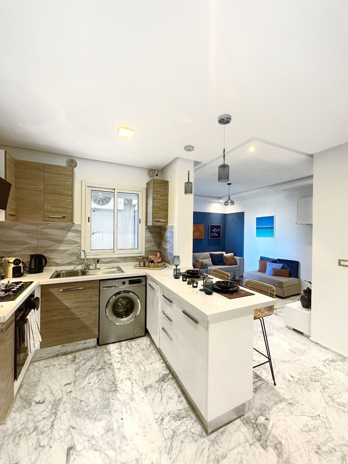 *一間臥室🛌配有加大雙人牀、方便使用的工作空間筆記型電腦和梳妝臺 *一間衛浴🛁配有浴室託盤、蠟燭、液體肥皁、衛生棉卷和乾淨毛巾 *設備精良的廚房🍳,提供早餐必需品,製作美味的突尼斯🇹🇳香料 🥘*廚房在寬敞的客廳開放,配有L型沙發,您可以在這裡欣賞您最喜歡的電影 🎥 *大陽臺,您可以在那裡享用下午茶,🍵欣賞美景(洗衣🧺機在角落裡)