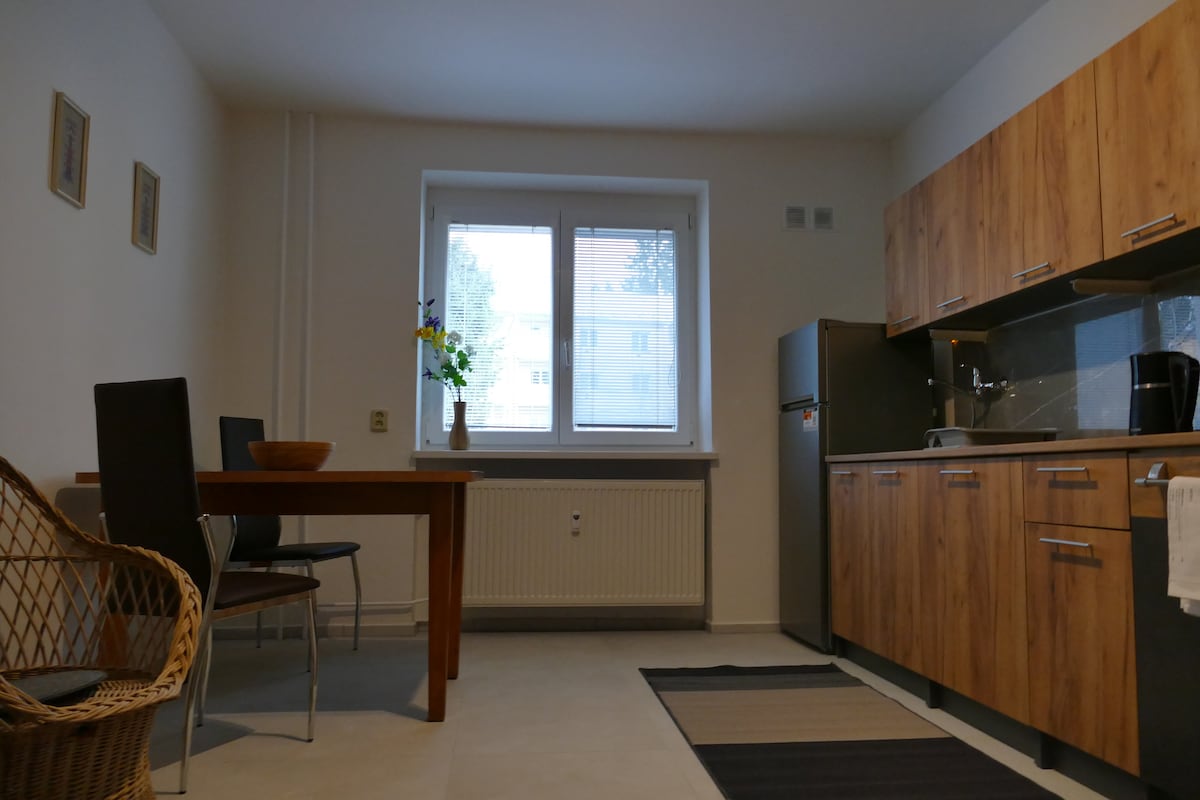 享受您在這個位置優越的地方的住宿。公寓距離所有民用設施僅一分鐘路程。開車 4 分鐘,步行 15 分鐘即可抵達市中心。這是一個帶獨立廚房的房間公寓。公寓配有沙發床,配有140x200厘米的床墊。經協議,也可提供嬰兒床。