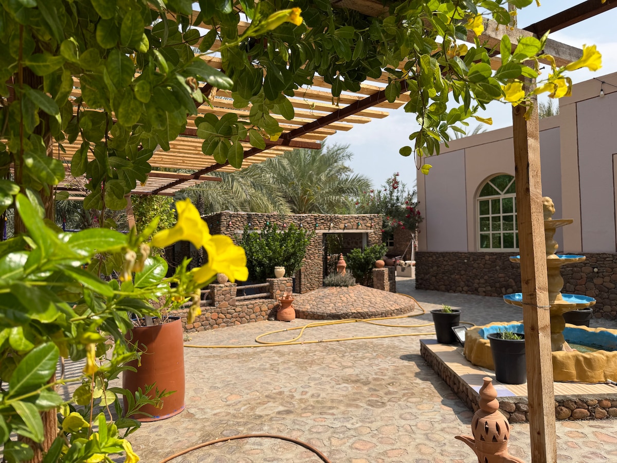 在這個靜謐的度假勝地,您可以與家人一起享受寧靜與放鬆。這裡飼養著鳥類、鴕鳥和孔雀等寵物,並設有各種戶外休憩區和一個傳統風格的戶外會客廳(majlis)。 我們建議尊貴的客人自備飲用水和食物,因為您可以在配備齊全的戶外廚房自行烹飪。 備註: 休息區附近沒有超市。