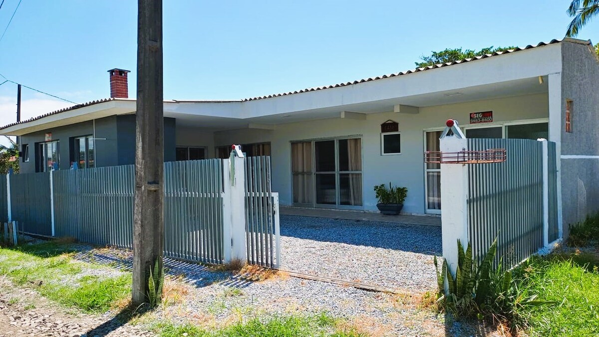 位於巴內阿里奧瓜西亞拉 (Balneário Guaciara)、馬蒂尼奧斯-巴拉那州 (Matinhos-PR) 的優質房屋,最多可容納 10 人。 距離海邊僅4個街區(步行7分鐘) · 3 間套房,配有吊扇 · 配有天花板風扇的廚房,配有爐子、冰箱、微波爐和其他用具,如圖所示 · 烤肉架 + 洗手間 · 智慧電視和網路 · 洗衣機 · 監控警報 ·停車位