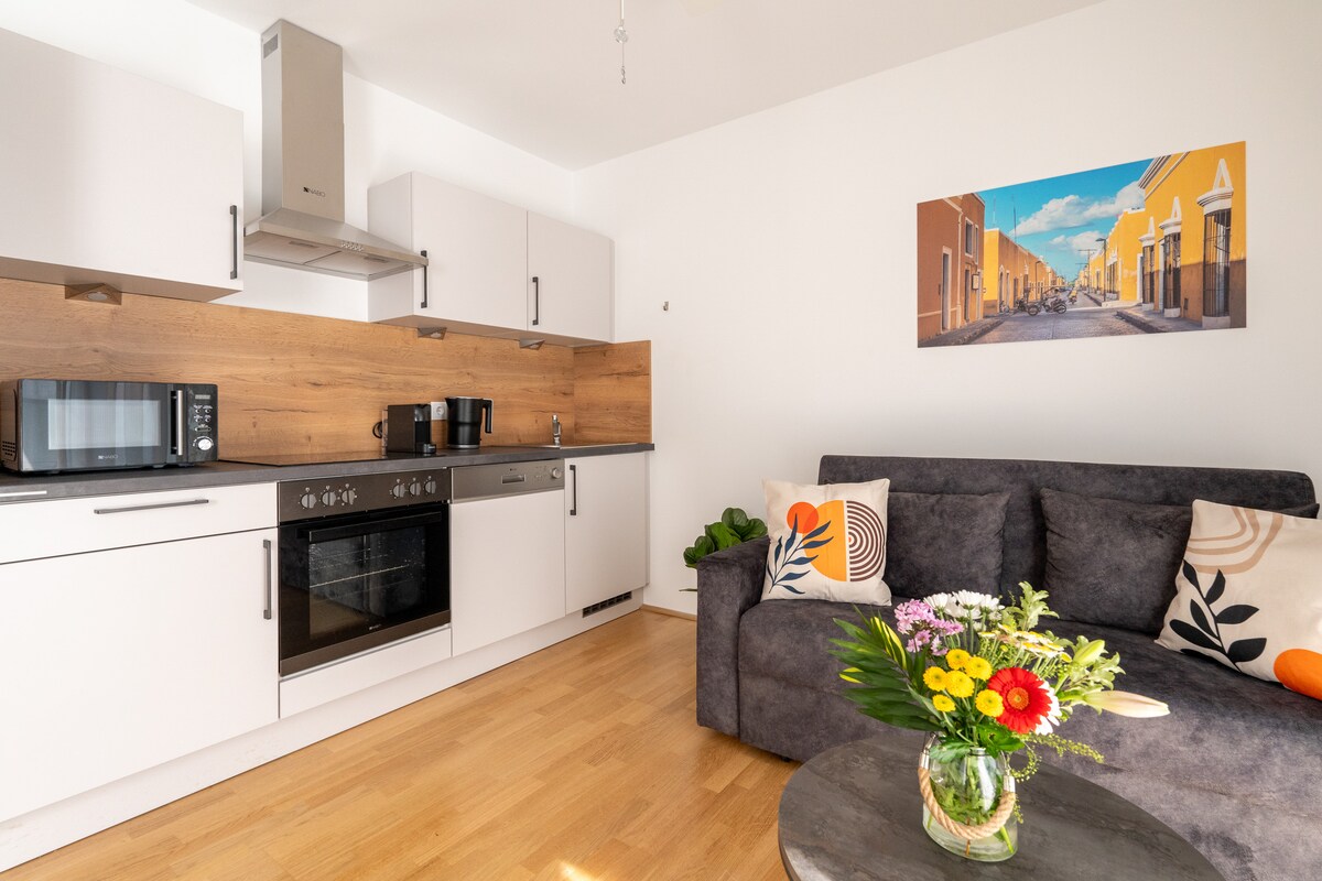 This comfortable apartment with terrace offers 45 m² of space for up to 2 people. The bedroom with double bed (180x200), the living room with smart TV and dining table and the modern bathroom with shower make this stay a perfect way to experience Vienna. The room also offers a fully equipped kitchen with sustainable coffee and tea facilities and a washing machine. Here you’ll have everything you need for maximum comfort and minimal stress.