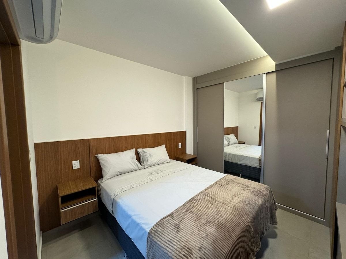 美麗的公寓,位於Ribeirão Preto市中心,有陽臺、臥室、浴室、美食空間和客廳。 臥室和客廳配有分體式空調、爐子、微波爐、迷你吧、高速(遠端工作)平板電視的WiFi、有線電視和設備齊全的廚房。 24小時大門配有代客泊車、有蓋車庫的停車位、健身房、遊泳池、桑拿房和餐廳服務。白天不含早餐。大樓仍有會議和會議室(不含服務)。