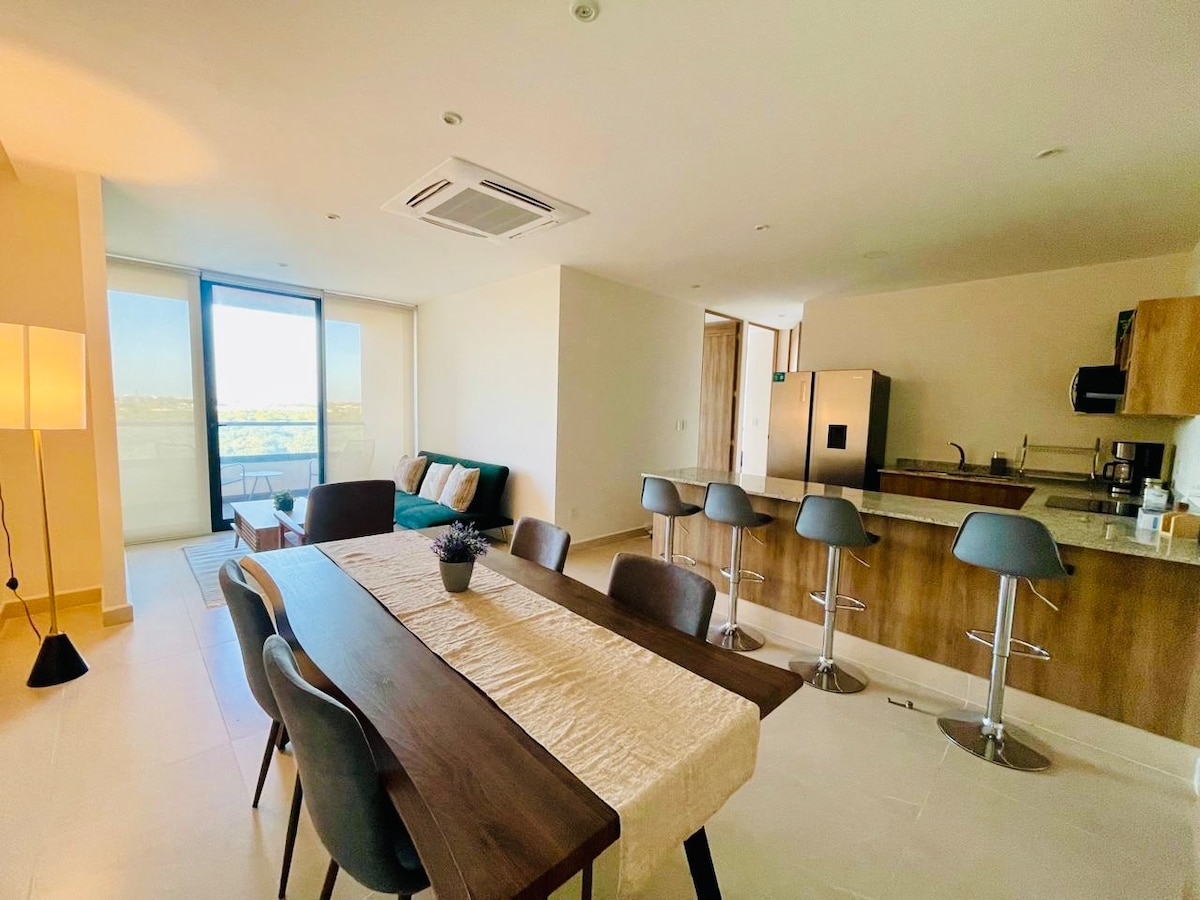 設備齊全的公寓,有 2 間臥室,配有空調和飯店床單、寬敞的廚房、電視客廳、餐廳和極佳的位置。 位於 HARBOR 商場前,距離 Galerías Mérida、Costco、Liverpool、21 世紀會議中心和瑪雅博物館 2 分鐘路程。 街角有公共交通工具。