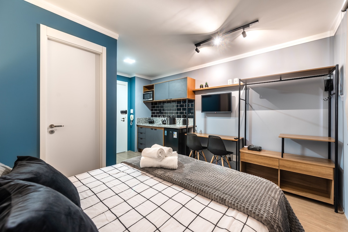 聖保羅單間公寓。我們距離Brás地鐵站2分鐘,靠近Brás、25 de Março、ZonaCerealista。 全套廚房 家庭辦公空間 Wi-Fi 健身房 游泳池 24 小時門房 Omo 自助洗衣店 24 小時便利商店