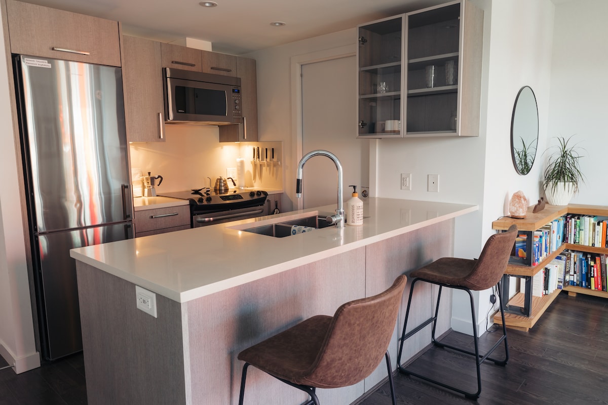 一間臥室公寓,位於電氣化的南主街(SoMa),在Mount Pleasant街區。這個區域到處都是當地餐廳、充滿活力的咖啡廳、精釀啤酒廠和時尚商店。步行10分鐘即可抵達最近的SkyTrain車站,1站即可抵達市中心/加斯敦。巴士站也很近。這是一個非常安靜的單位,面向庭院,整個房間光線充足。公寓大樓現代化,經過精心維護和保護。