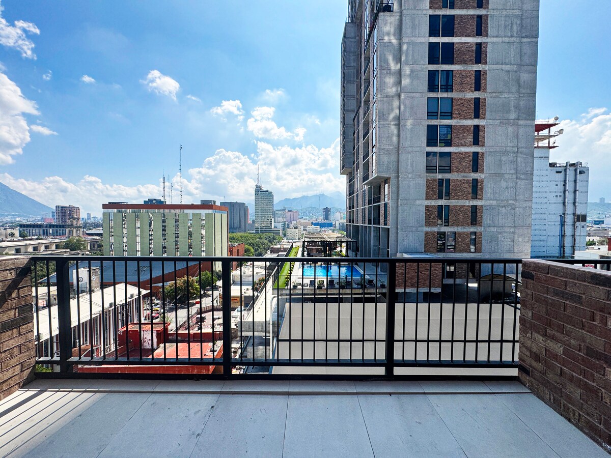 全新精品公寓,位於蒙特雷市中心的 MYO 大樓。距離Macroplaza兩個街區,距離聖露西亞大道一個街區,距離Antiguo區兩個街區,大樓露台上有烤肉區,大樓內有一輛車的停車位,靠近便利店、教堂、餐廳、博物館,地理位置優越,適合探索這座城市。