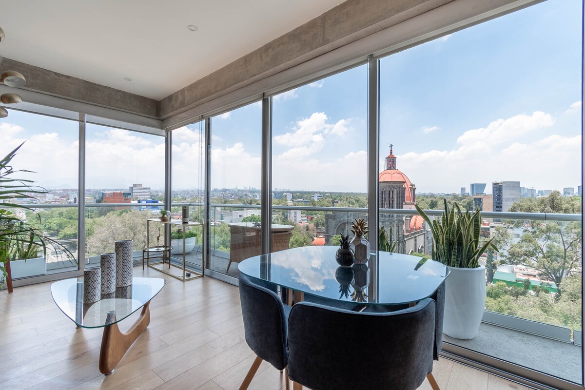 This one of a kind and cozy pent-house is located inside one of the most emblematic developments built in La Condesa neighborhood. Its architecture is a contemporary version of Art Deco. A style that defines La Condesa. It is located in a beautiful, tree-lined area. The atmosphere is very family-oriented, with young and vibrant people. The surroundings invite us to step out, walk, relax and discover new experiences.