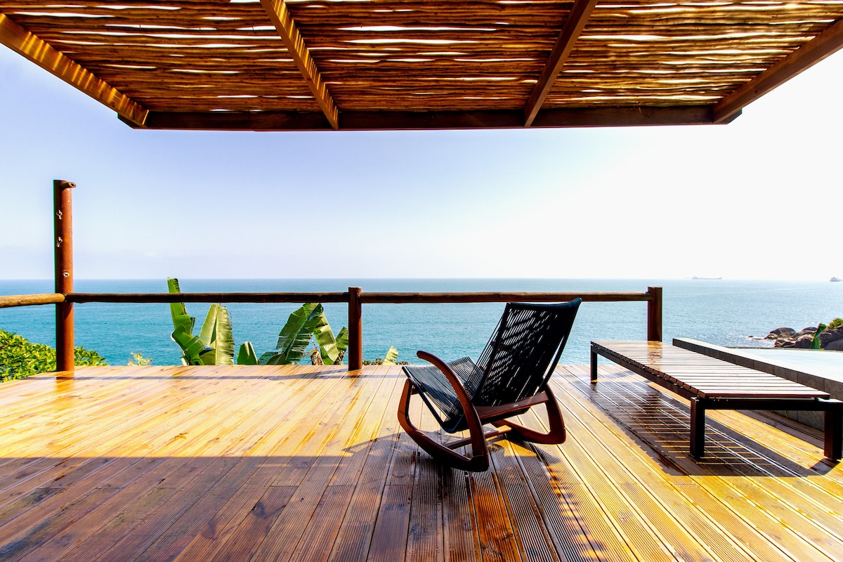 面向大海的迷人度假木屋,客廳與廚房和沙發牀相連,臥室、大陽臺、完整的浴室、配有淋浴間和許多樹木的花園、高速WiFi。 從停車場( Maria Caetana Street ) ( Maria Caetana Street )步行( 10分鐘)即可抵達房源。 提供行李寄存方面的幫助。