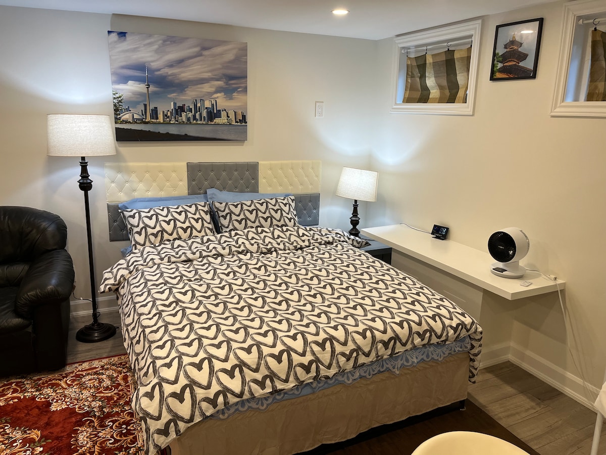 Welcome to our cozy basement apartment! This modern Airbnb is located in a peaceful residential neighborhood 40 min drive from Toronto downtown and an hour from Niagara Falls. The well-lit space features a comfortable queen-sized bed, ample storage in the spacious closet, and a beautifully designed interior with natural light flooding through large windows. Note: We have 2 single folding matresses available to place on the floor in the living room. Extra linen and pillows are provided.