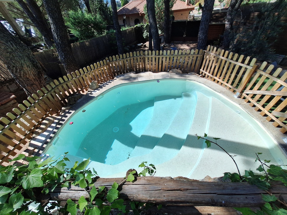 Preciosa casa de los 60 rehabilitada, en una gran parcela de 1500m con piscina privada y grandes árboles. Tranquilidad y privacidad en el corazón del bosque en uno de los pueblos más bonitos de la sierra de Madrid. Podrás caminar durante días por los bosques y montañas del parque nacional de Guadarrama desde la misma puerta de casa. Ideal para compartir dos familias. Totalmente equipado con mucho encanto. Chimenea, Barbacoa de gas, ping-pong, cama elástica, tobogán, canasta basket, wi-fi...