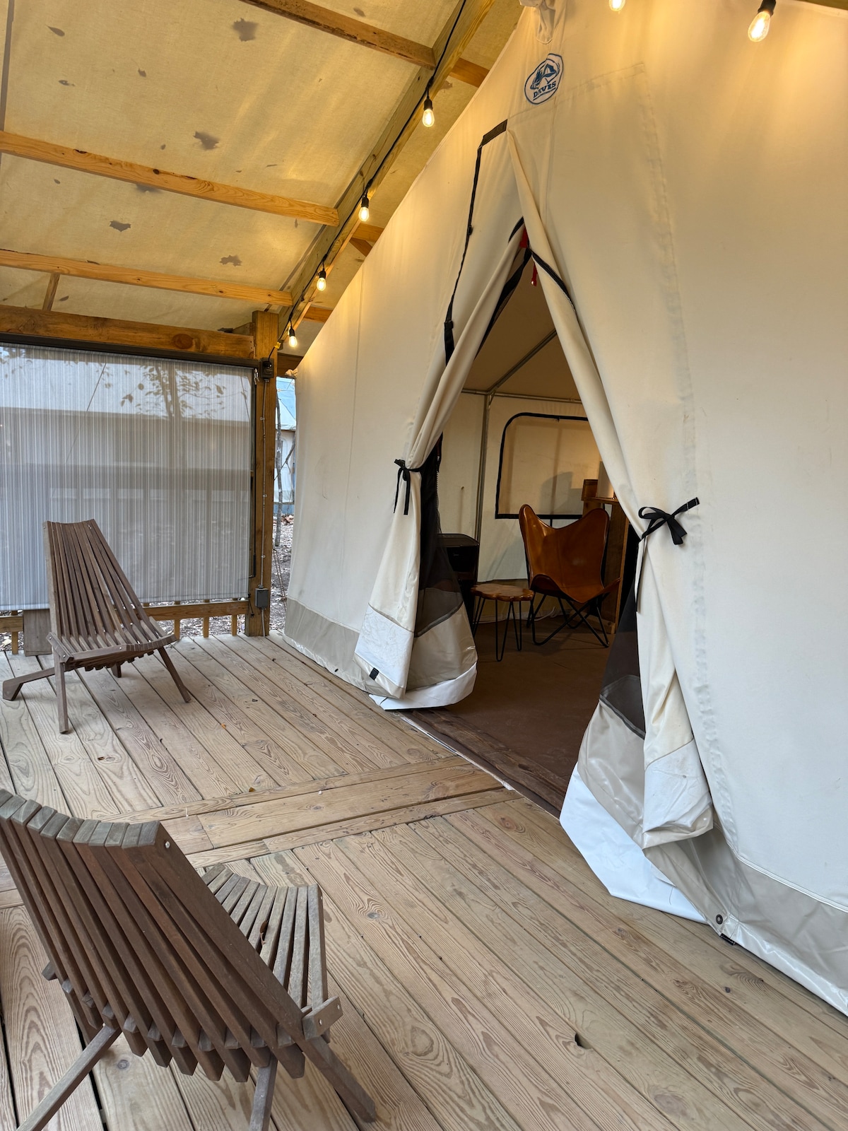 Cozy glamping safari tent at small lakeside resort