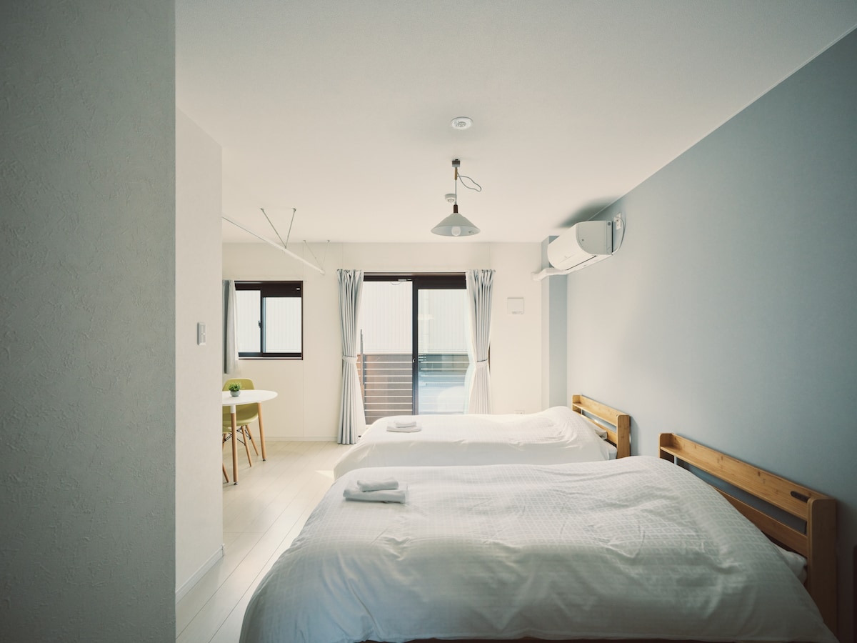 1R 型公寓。 公寓配有洗衣机、冰箱、微波炉、电视和其他家用电器。 提供厨房、炊具和餐具,您可以自己准备饭菜! (出于卫生原因,不提供调味料。 请自备)。 房间内还提供牙刷等生活用品,方便您随时使用。 提供两张单人床。 5 岁以下儿童可免费入住。 请注意,在这种情况下,儿童必须与成人同睡。 Â 关于办理入住手续。 预订确认后,我们将通过电子邮件向您发送入住手册。