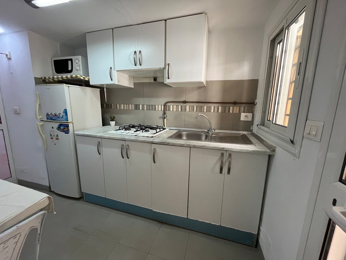 別墅的一層,面積100平方公尺,獨立入口,位於一個城市中,周圍有商店、餐廳和醫療中心,距離突尼斯迦太基機場20分鐘 住宿是最近建造的,明亮完美,全新家具,包括一間臥室,配有一張雙人床,另一間臥室開放到客廳,配有一張單人床_2張其他矯形床墊2人_和兩間阿拉伯風格和現代客廳,設備齊全的廚房,帶意大利淋浴間和2臺空調。