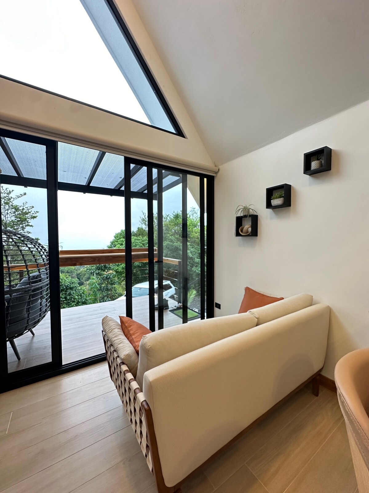 Jaguar Houses is conveniently located between the center of town and some of the most popular attractions in the area such as Canopy Zip Lining, Suspended Bridges and the Santa Elena Nature Reserve. Inspired by Nordic architecture, Jaguar is composed of 3 independent homes, elevated on pillars, giving you the impression of floating on the trees. The 3 houses are identical however the view can slightly change from one to another. The photos used for each listing are a mix of the 3 houses.