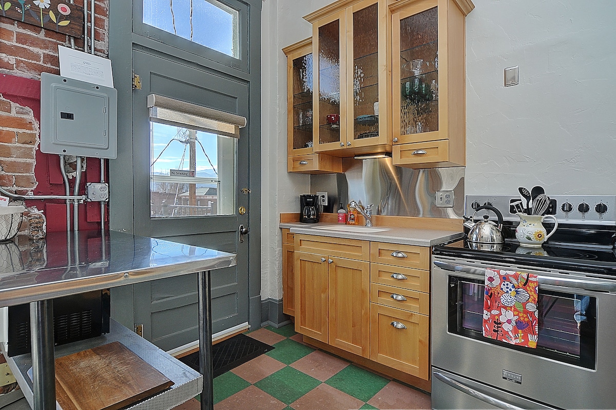 歡迎來到我們新翻修的歷史悠久的市中心閣樓!這間舒適的單間公寓坐落在市中心,距離阿肯色河、S山步道、市中心所有古樸的商店和每間酒吧和餐廳不到一個街區! 公寓提供全套廚房、加大雙人床、拉出式沙發床、步入式淋浴間,所有藝術品均由當地藝術家製作! 當您來到這個市中心閣樓時,體驗山鎮生活方式!玩得愉快!