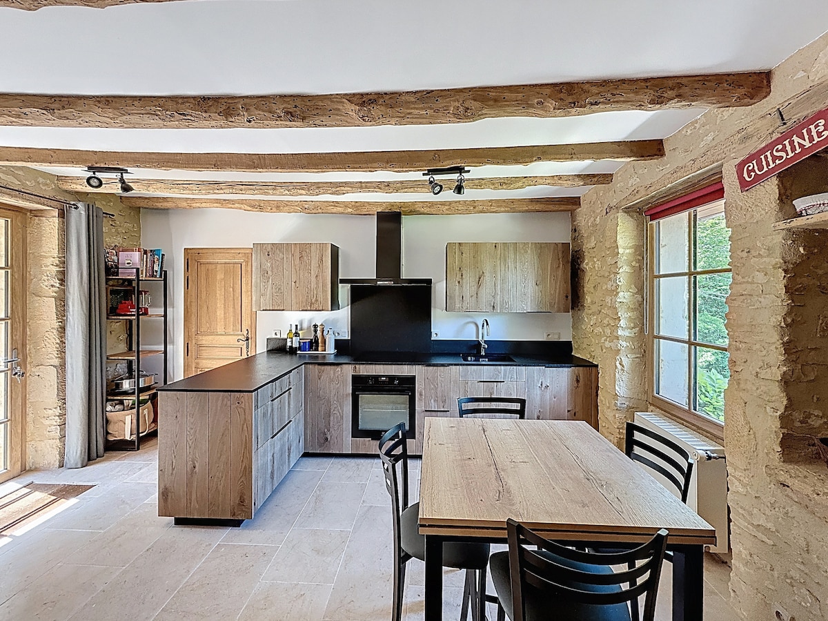 18 世紀建築,提供 35 平方公尺的獨立住宿,經過全面翻新,配有露台,可在早晨享用陽光下的咖啡。 單間公寓的設計圍繞著一個開放式廚房,配有橡木吧台、休息區和智慧電視。臥室配有 Buletex 床墊和石頭浴室。 您將在一個安靜的環境中,距離商店和多爾多涅河游泳區不到一公里。 靠近法國最美麗的村莊、城堡和花園。