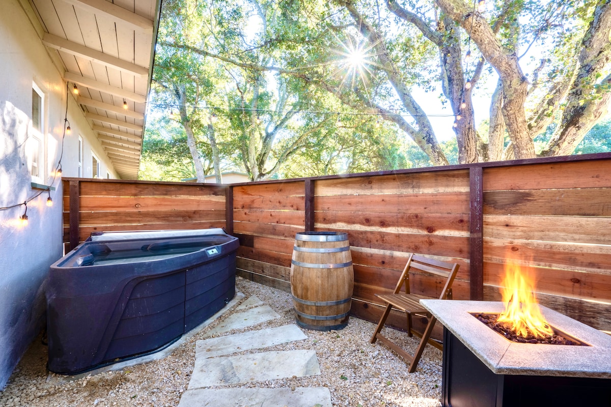Located 1 mile from Carmel valley Village and 12 miles from Carmel by the Sea. This space is ideal for those who love the outdoors and wine-tasting as we are 1 mile from 22 wine-tasting rooms in the village and surrounded by an abundance of nature and hiking trails alike. The space is cozy- your own private space with a comfy king bed, full bathroom, a mini fridge + microwave and private yard with a hot tub and fire-pit.