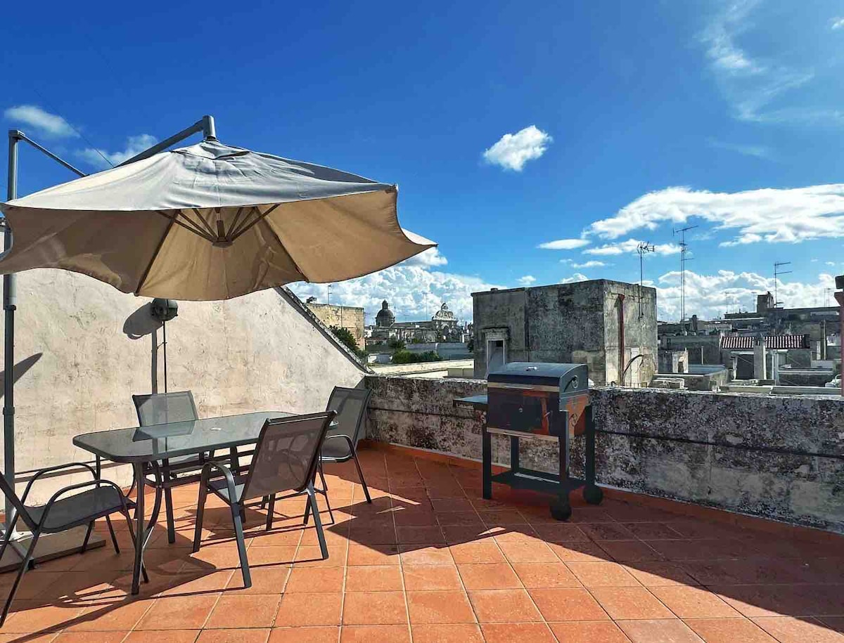 Grazioso trilocale (80 mq.) in una prestigiosa dimora del XVII° secolo, nel cuore del centro storico di Lecce (via Umberto I), adiacente alla Basilica di Santa Croce, a pochi passi dai principali monumenti e da tutte le altre attrazioni turistiche della città; ideale per una vacanza tra cultura e tradizioni, divertimento e relax. L'appartamento, servito da ascensore, è al secondo ed ultimo piano del palazzo ed è dotato di una splendida ed attrezzata terrazza a livello (40 mq.)