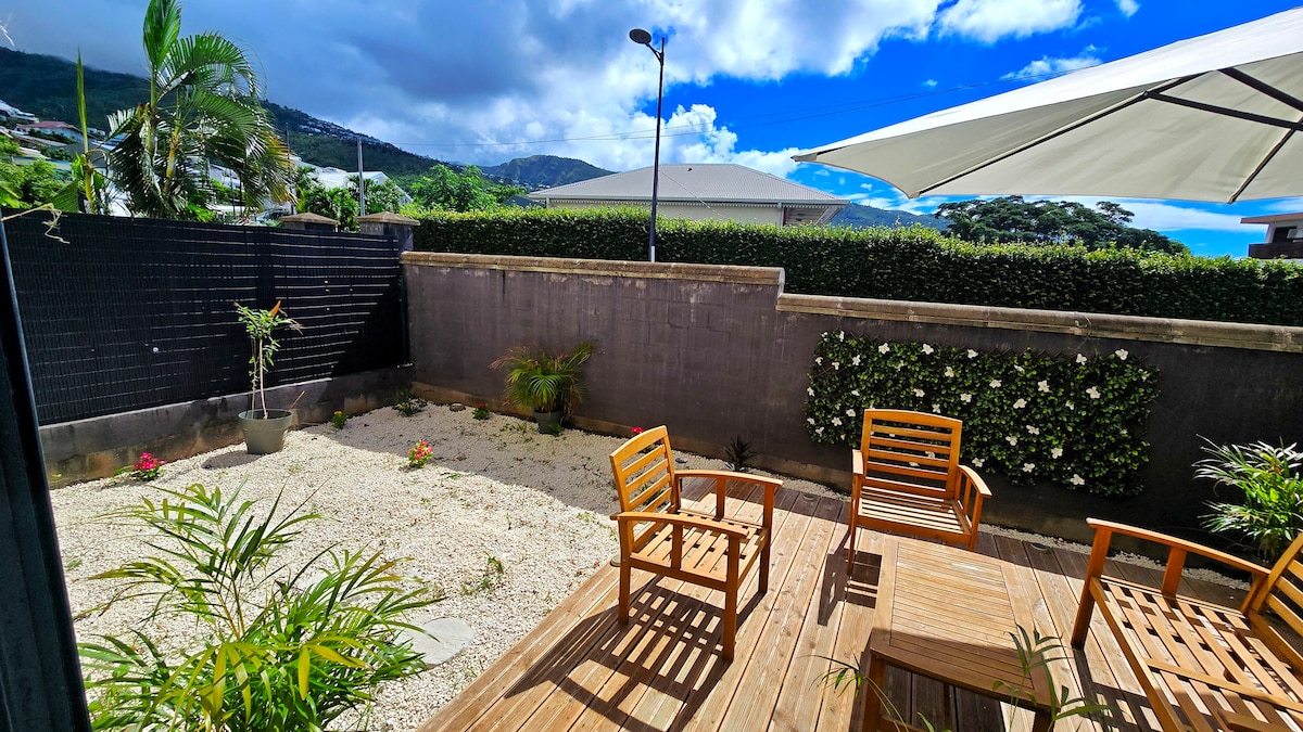 享受迷人的28平方公尺房源,可容納2人,配有設備齊全的廚房、獨立臥室、步入式淋浴間和15平方公尺的私人陽臺。 它位於我們別墅的花園層,可使用共用溫水泳池。 聖但尼斯及其海岸線的全景。 簡單的路邊停車位 開車10分鐘即可抵達商店, 15分鐘即可抵達市中心, 20分鐘即可抵達機場, 40分鐘即可抵達西部海灘,開車1小時即可抵達Salazie Circus。
