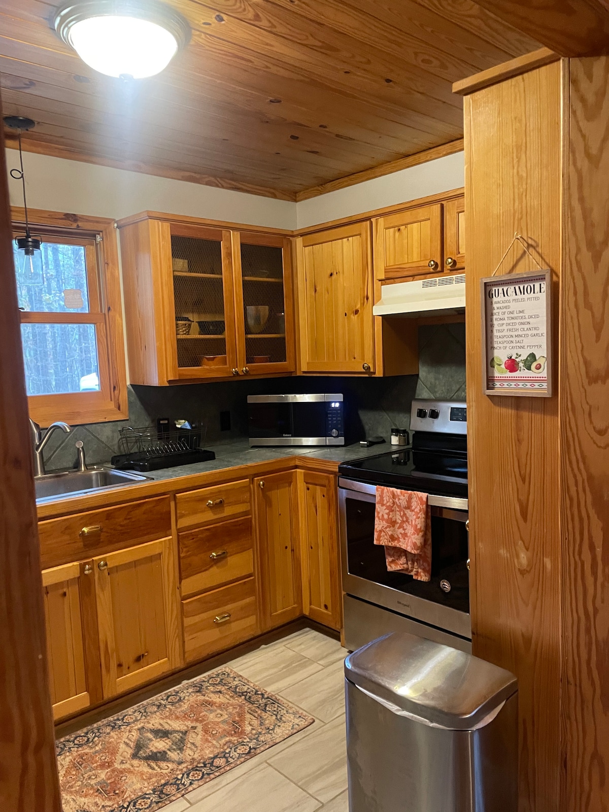 Enjoy the peace of this cozy cabin. The kitchen is fully stocked with cooking utensils, pots, pans, baking pans, dishes and serving utensils, coffee pot, toaster, microwave, crock pot, blender. We supply coffee etc., salt, pepper. Bath towels, wash clothes, toilet paper and soaps. The beds are made with fresh linens. The covered deck faces the woods where you can enjoy the sound of the river. Cook out on the grill and enjoy a fire in the firepit. Wash your treasures on the outside table.