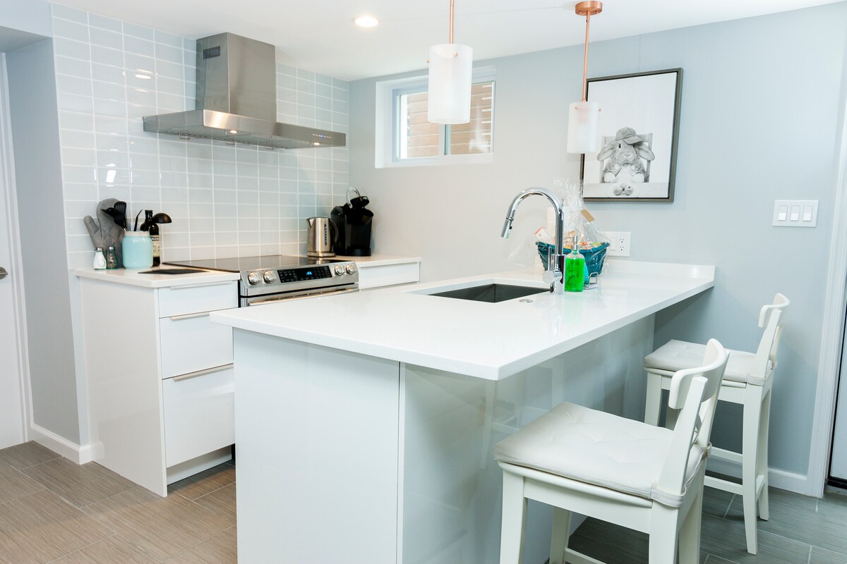 歡迎入住寬敞的私人地下室公寓,有自己的入口和自助入住。與您的客人一起舒適地入住,房源內有一間臥室,配有加大雙人床、85 吋智慧電視、柔軟的組合沙發、獨立廁所、浴室和小廚房,所有這些都在同一個空間內。沒有共用的設備。 設備齊全的小廚房,提供烹飪和加熱餐點所需的一切。客用套房是整套地下室公寓,是房東居住的大房源的一部分。
