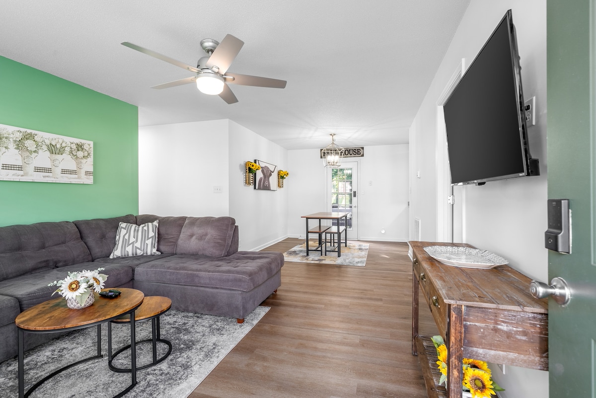 Kick back and relax in this calm, stylish space. With 2 living rooms & an outdoor living area, there will be plenty of space for you to spread out and get comfy. New 65" Smart TV & long comfy couch - perfect for movie nights with the whole group! Local Attractions- 5 miles from Downtown Clarksville (~10min) 15 miles from Fort Campbell (~30min) 45 miles from Downtown Nashville (~45min)