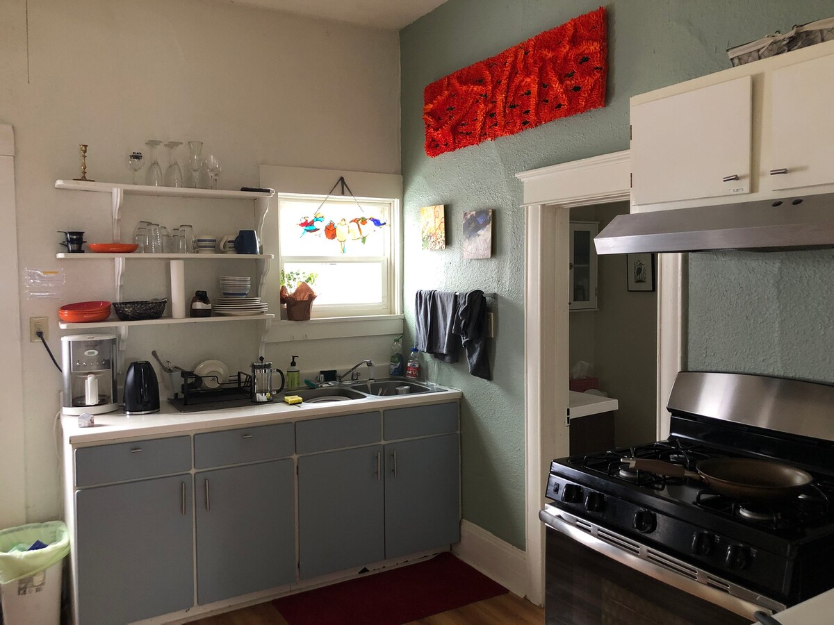 這間旅居是位於佩奧尼亞市中心的舒適120年歷史的美麗旅居。 距離城市公園以南一個街區,距離大街五個街區。 配備現代家具,與古董並置。 高高的天花板,天花板風扇,適合七月的夜晚,還有煤氣壁爐,適合涼爽的夜晚。 門鎖密碼讓旅人可以立即入住。 一個大圍欄庭院、街外停車位和私隱,為您提供完美度假所需的一切。 如果你願意,雙人床可以變成加大雙人床!