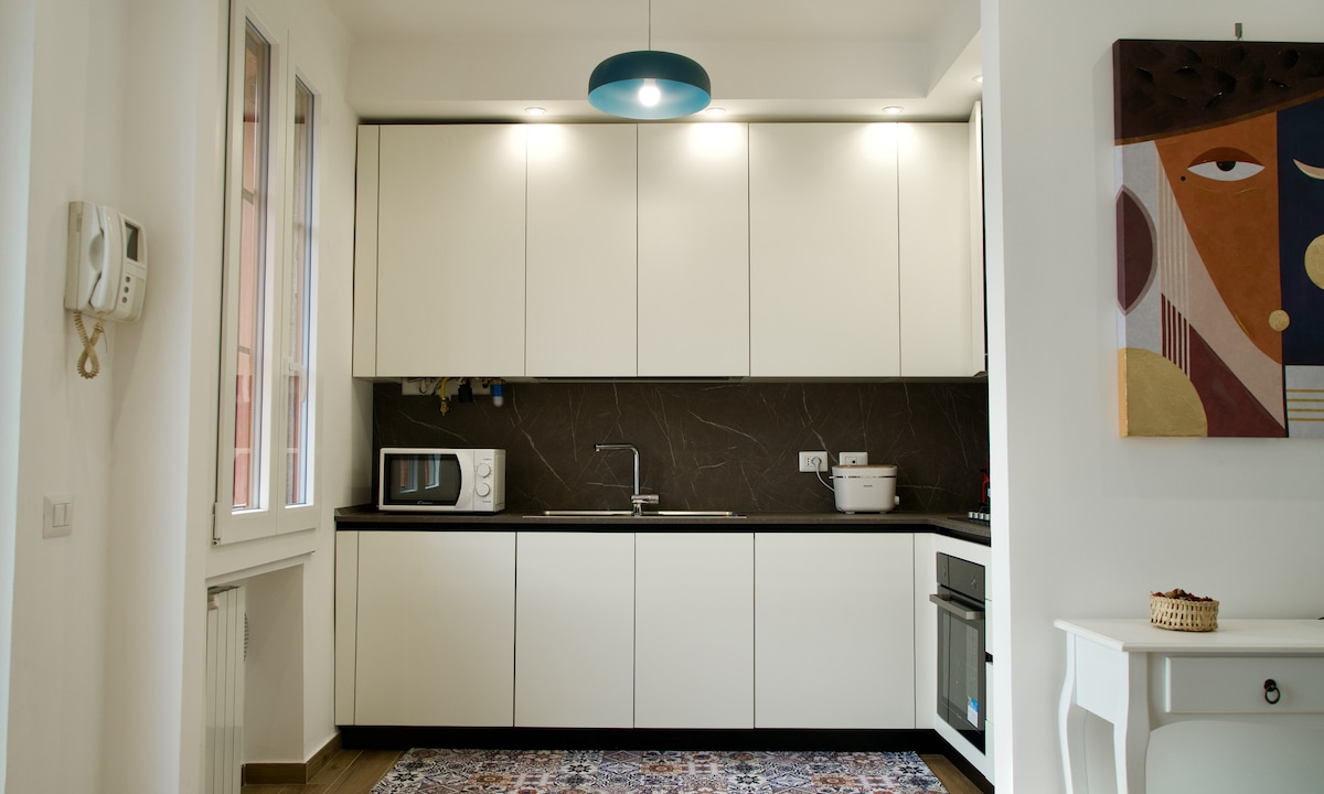這間優雅的住宿非常適合商務差旅、情侶和家庭入住。位於一樓的 75 平方公尺寬敞兩房公寓,配備所有舒適設施,但沒有電梯。舒適的客廳,配有雙人沙發床(17 公分床墊)、可收看 Sky/Netflix 節目的 50 吋智慧電視、光纖 WiFi 連線。全套廚房:電磁爐、冰箱、烤箱、洗碗機、微波爐、咖啡機和電熱水壺。全套浴室,配有大淋浴間、馬桶和坐浴盆。 房間內設有衣櫃。