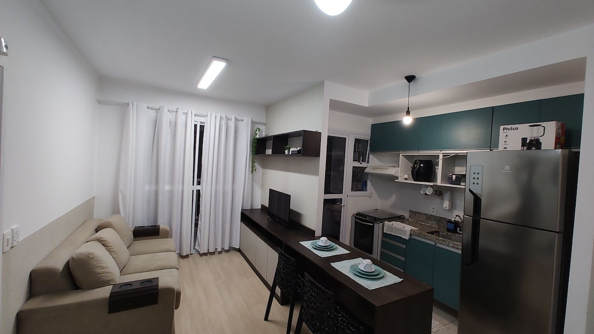 Oferecemos um lugar iluminado, bem arejado, limpo e aconchegante, aqui tem todos equipamentos para sua estadia: Louças, pano de copa, torradeira... Fogão de indução, geladeira, Smart TV 32´ Uma vaga de garagem (não cabe carro grande) Piscina externa climatizada e academia Internet 300 Mg e TV a cabo Disponibilizamos roupas de cama e banho disponível, solicitação prévia 48hs.