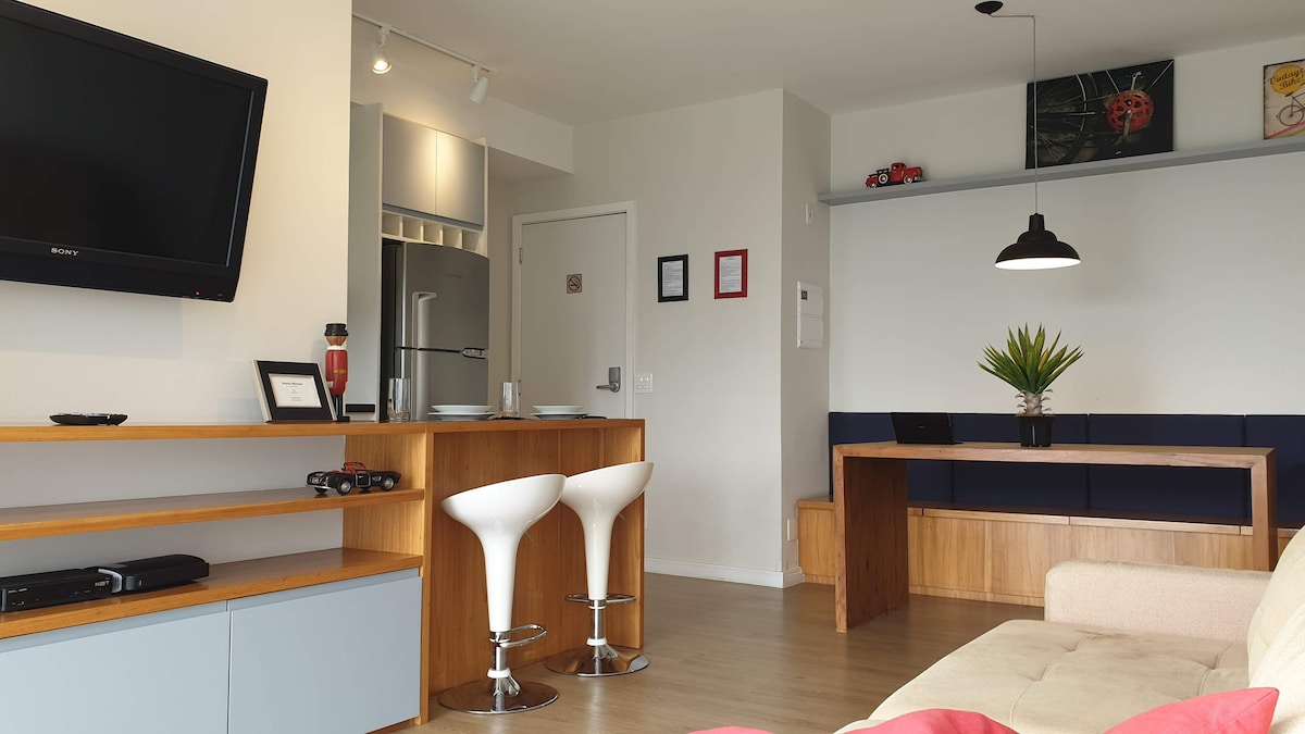 享受全新、現代化和裝潢精美的公寓,欣賞迷人的景色。 你將擁有獨立的空間,而不是狹窄的單間公寓,最多可容納4位房客。 位置方便,毗鄰布魯克林站,靠近Moema、Pinheiros、Berrini、美國大使館和孔戈尼亞斯機場,在一條安靜安全的街道上。 大樓提供健身房、泳池、桑拿房和共享工作空間等設備與服務,門口就有一流的餐廳、超市和藥店。