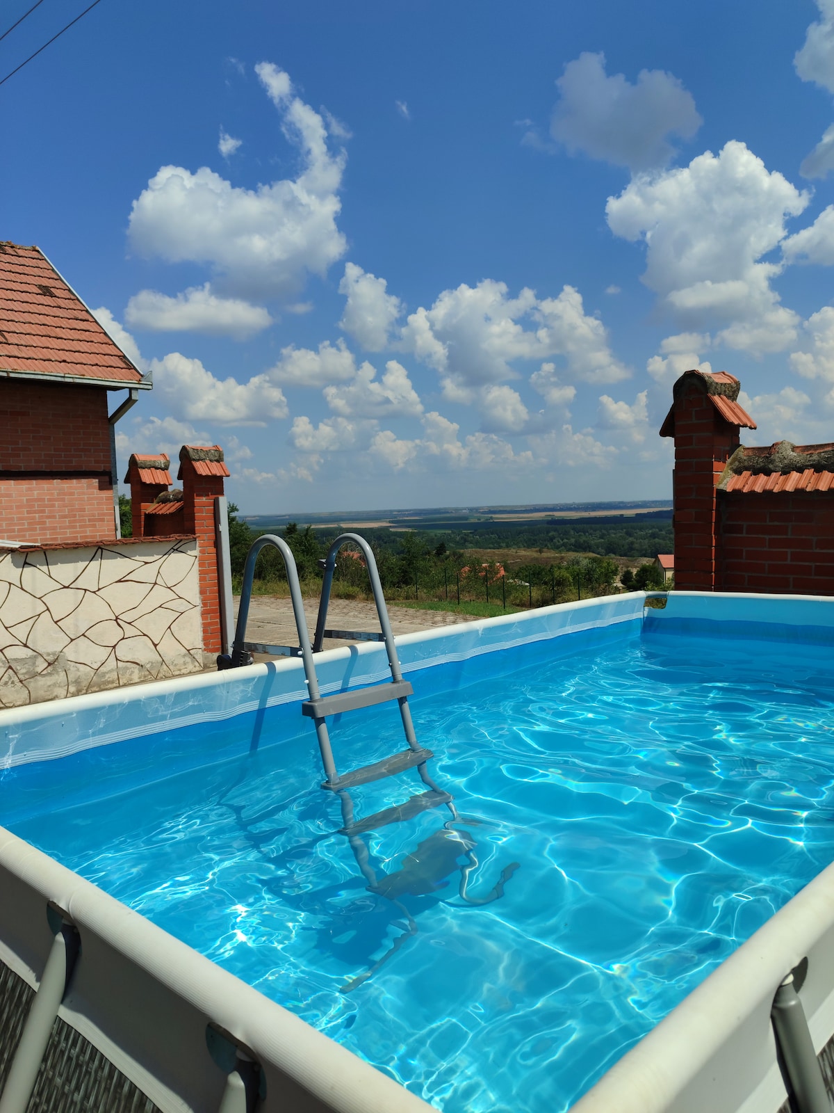 可欣賞諾維薩德、伏伊伏丁那和多瑙河美景的房子。距離諾維薩德市中心僅10分鐘路程。它有客廳、餐廳、廚房、浴室和3間臥室。開放式露臺,可欣賞城市景觀,可欣賞最美麗的日落景觀,有35個座位,配有設備齊全的廚房、烤架、音響系統和廁所。院子裡有一個兒童遊樂場,有滑梯、游泳池和火坑,您可以坐在火坑旁的鞦韆上。