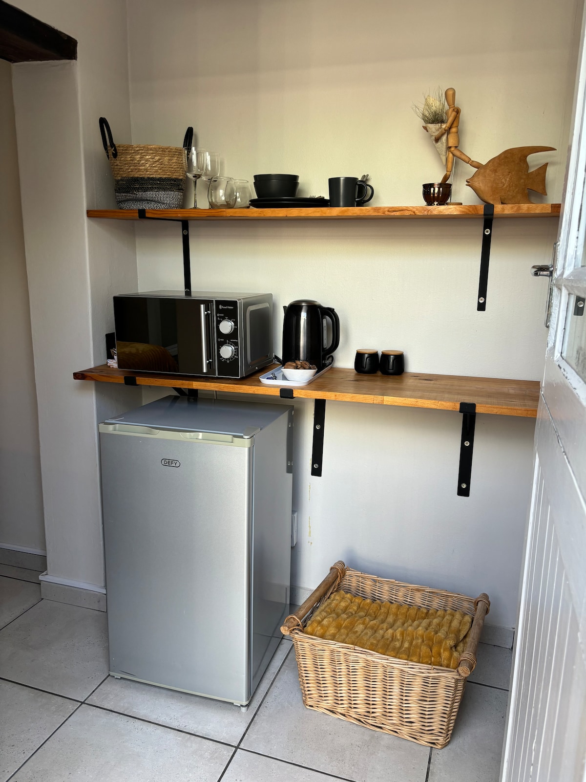 Tucked away in tranquil private garden, this charming hideaway invites you to slow down and unwind. Sink into a queen-size bed dressed in crisp white linen, enjoy the comfort of an en-suite shower, make yourself at home with a cozy kitchenette featuring a microwave, bar fridge, and Nespresso coffee machine. Fast Wi-Fi, peaceful surroundings, and a romantic atmosphere await. A hot tub is available on request at R500 per session, and the sauna at R150 per person — perfect for relaxing together.