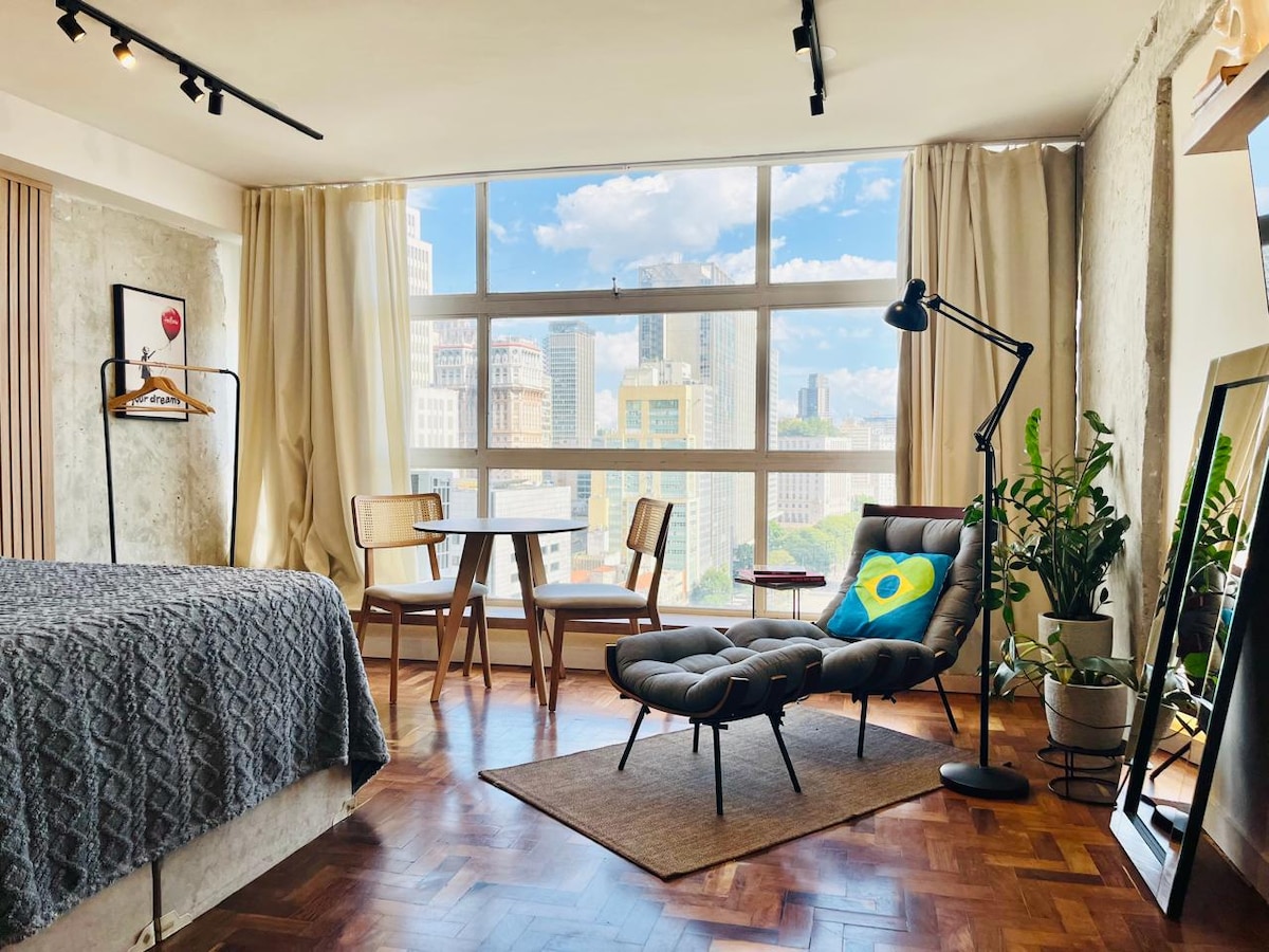 35平方米的工業單間公寓,位於39樓,可欣賞Anhangabaú谷的全景。 現代環境,混凝土、外露的磚頭、木材、金屬和Caio Fonseca的獨家壁畫,為環境帶來身份和真實性。 靠近酒吧、餐廳、共和國美食路線、熱門商店和劇院/博物館/文化中心。 非常適合在聖保羅市中心尋求舒適和時尚的情侶、攝影師和數碼遊牧者。