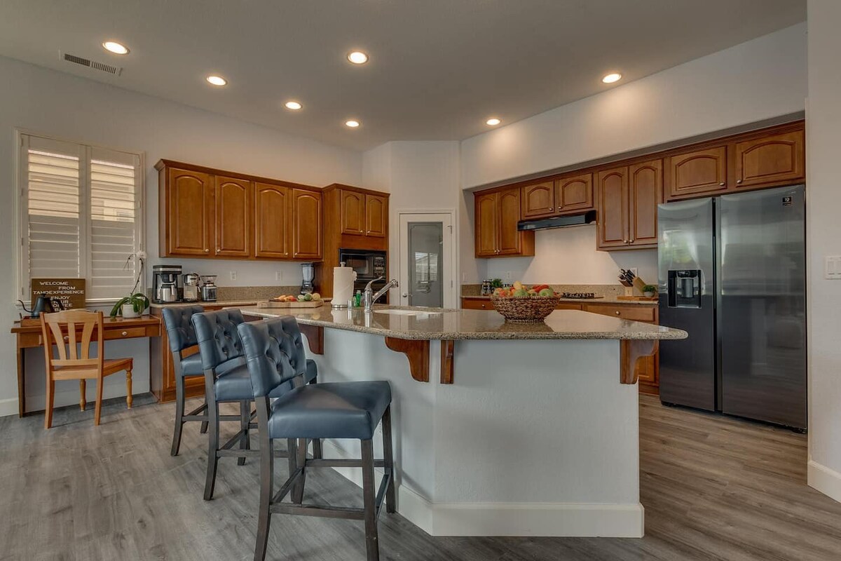 這座新建的2500平方英尺的南里諾房源提供您可能需要的一切物品,讓您的里諾之旅輕鬆愉快。它有四間臥室、一個美麗的後院,配有按摩浴池、客廳配有85英寸智慧電視(每間臥室都配有智慧電視)、設備齊全的廚房、2級電動車充電器等。美麗的南雷諾是參觀太浩湖、探索雷諾、遠距工作或與親友一起度假的完美家庭基地。
