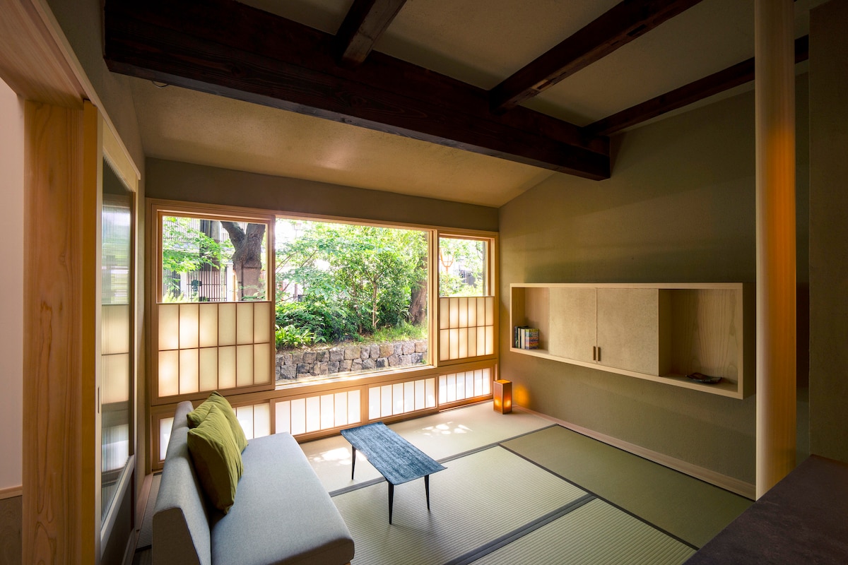 「Tabitabi 太子」是由傳統的日式老宅改造而成的傳統兩層樓京町屋旅館。設計上大量運用了手工印染的日式唐紙,錫箔金箔制作的墻紙等日本傳統的工藝和元素,又融合了具有現代感的空間設計,對整個房子進行全新詮釋。 一進門的日式庭園,搭配大片落地窗的設計,開闊的視野讓您坐在室內即能獨享日式庭園造景。二樓塌塌米和室房間,使用了創業400年唐紙老舖「唐長」所製作的唐紙,兩扇襖絵使用稱做「しふく刷り」的技法繪出蓮花與流水,為在此停留住宿的旅人祈福之意味。另一側洋式房間,透過特別設計的橫窗,躺在床榻上即能欣賞窗外的日式枯山水庭院,隨著一日中的光影變化,別有一番風味。 在這裡,您可以體會最原汁原味純粹的日本風情,也可以感受到現代元素與傳統工藝結合的匠心獨運。