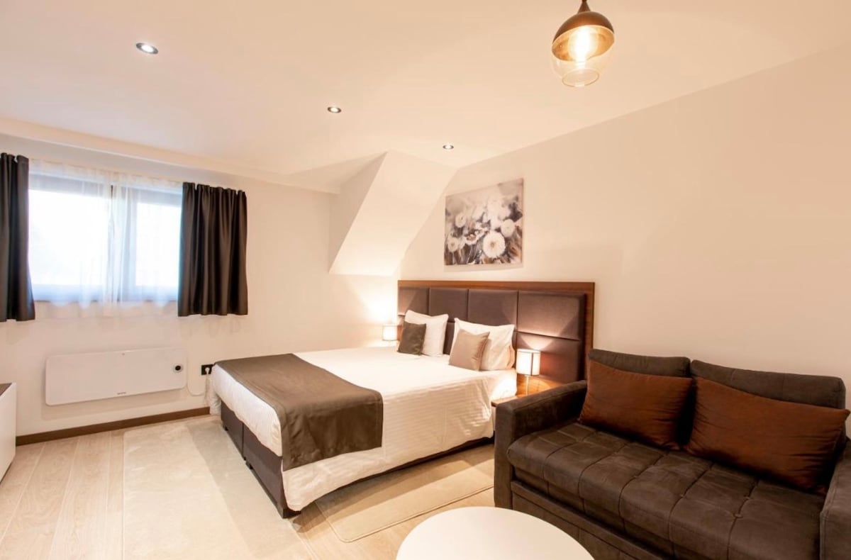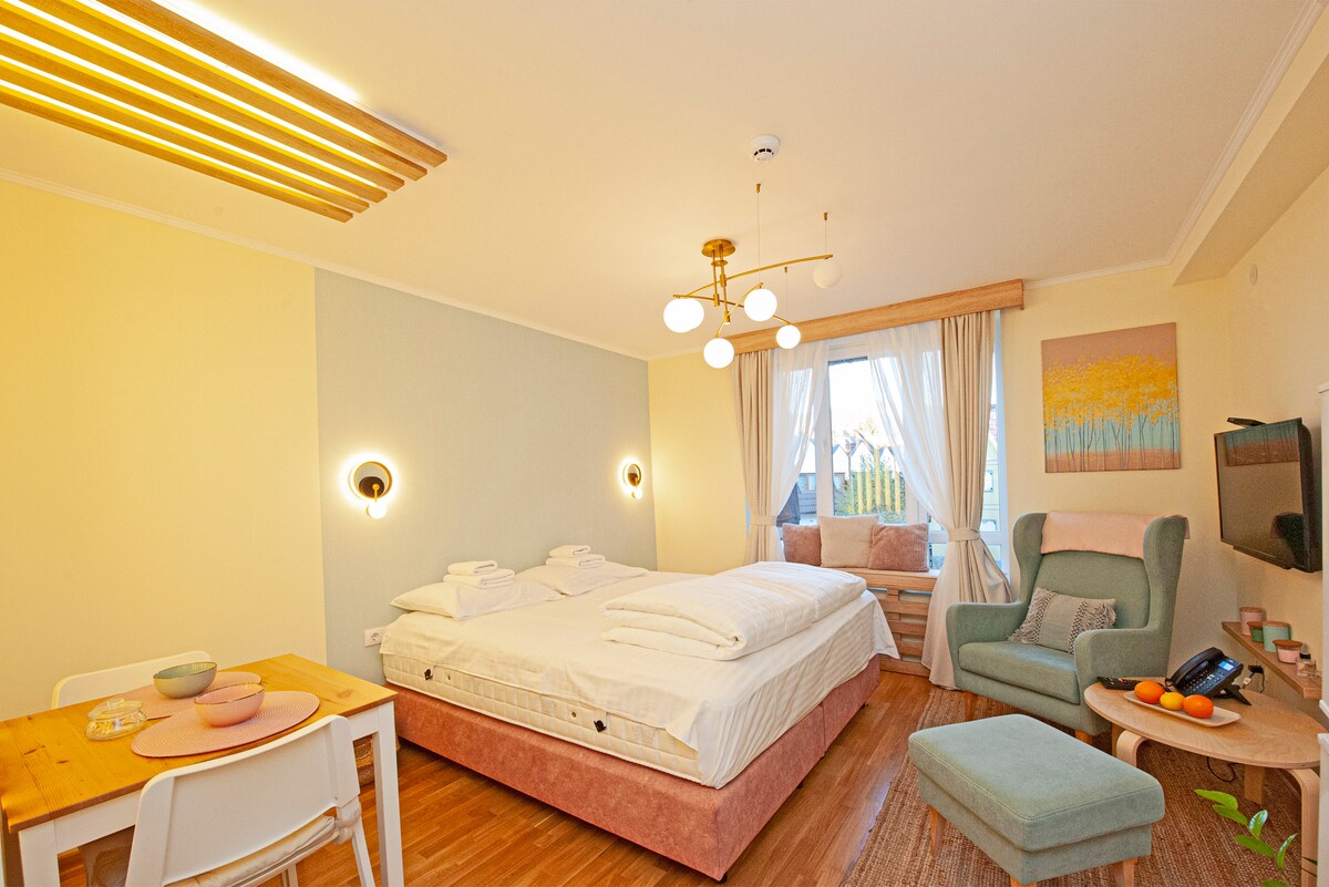 Equipped with high-quality furniture pieces for relaxation and comfort, Cozy Lodge features a modern elevated King size bed for exceptional comfort, all aimed at making you feel cozy and welcomed. The apartment also includes a kitchen with all necessary utensils, a refrigerator, oven, microwave, a two-burner stove, as well as a table for work and dining. Towels, bed linens, a hairdryer, an iron, and toiletries are provided, so don't worry about that ☺️ *spa and parking is not complementary